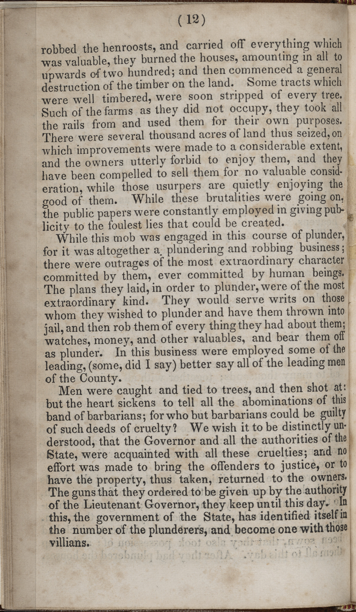 Men were caught and tied to trees, and then shot at: but the heart sickens to tell all the abominations of this band of barbarians; for who but barbarians could be guilty of such deeds of cruelty? We wish it to be distinctly understood, that the and all the authorities of the , were acquainted with these cruelties; and no effort was made to bring the offenders to justice, or to have the property, thus taken, returned to the owners. The guns that they ordered to be given up by the authority of the , they keep until this day. In this, the government of the , has identified itself in the number of the plunderers, and become one with those villians. [p. 12]