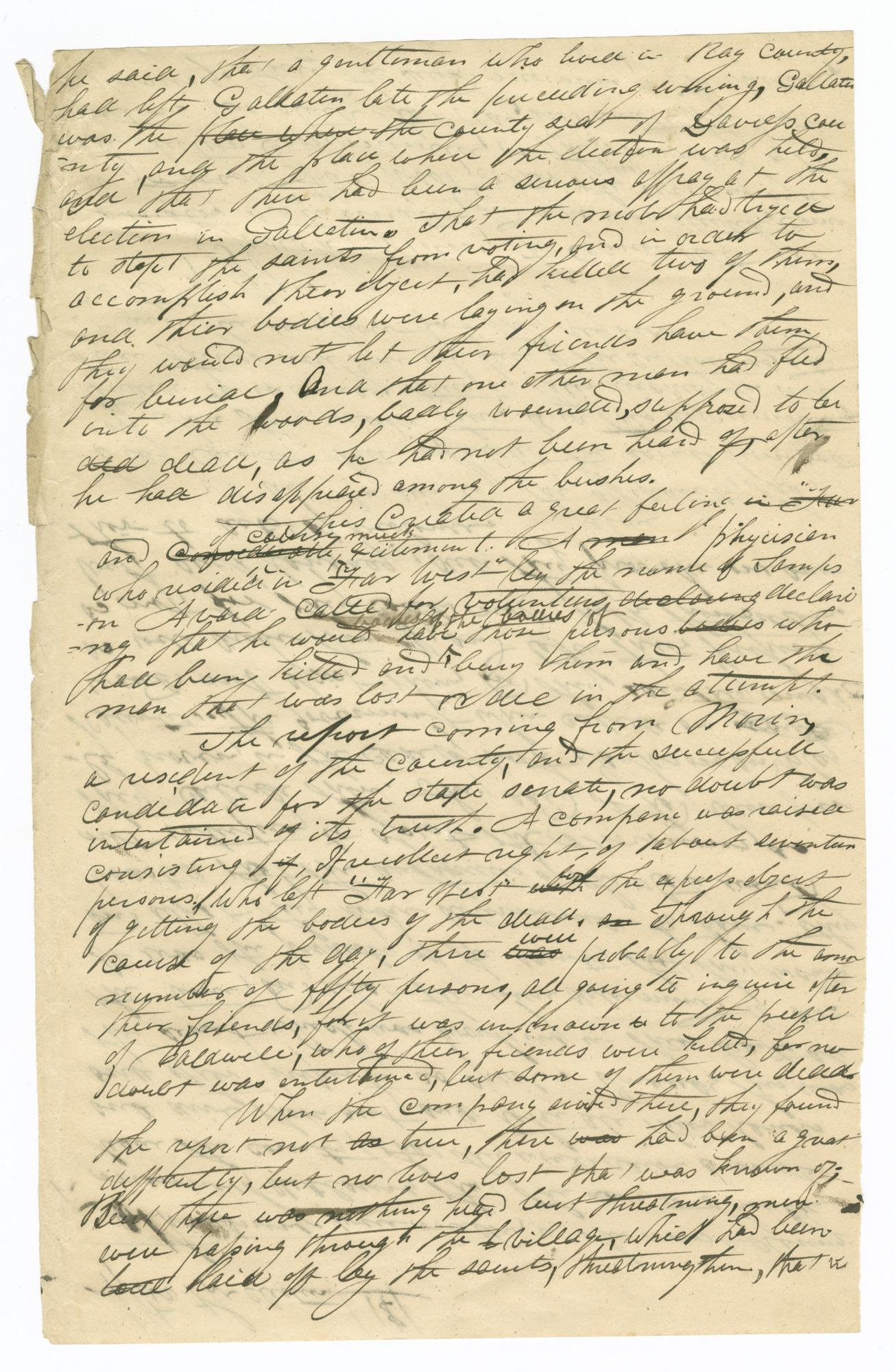 The report coming from , a resident of the , and the successfull candidate for the senate, no doubt was intertained of its truth. A company was raised consisting if, If recollect right, of about seventeen persons, who left “” with <for> the express object of getting the bodies of the dead. an Through the course of the day, there was <were> probably to the amo[unt?] number of fifty persons, all going to inquire after their friends, for it was unknown to the peeple of , who of their friends were killed, for no doubt was entertained, but some of them were dead.