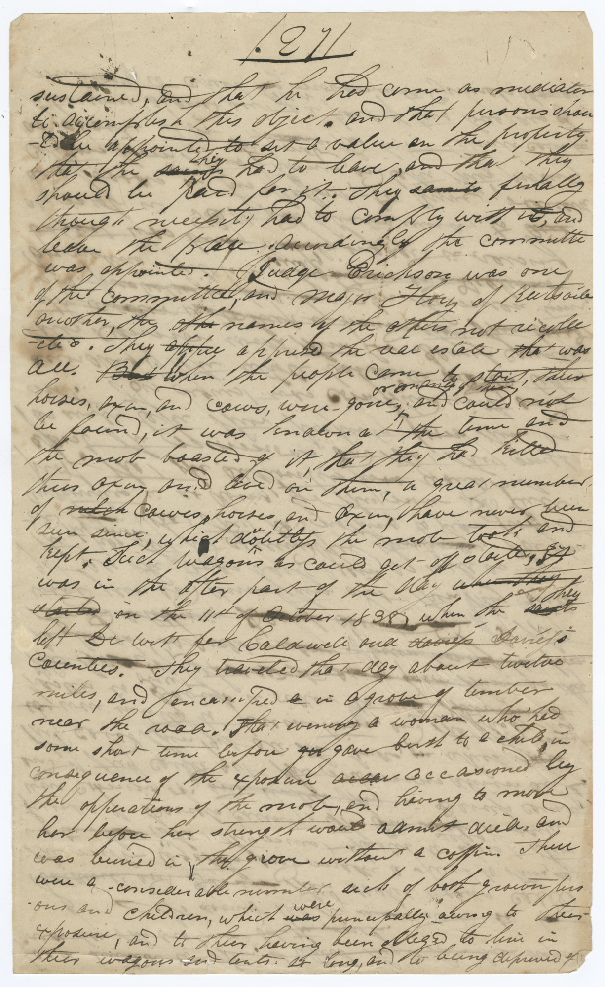 sustained, and that he had come as mediator to accomplish this object. and that persons should be appointed to set a value on the property that the saints <they> had to leave, and that they should be paid for it. The<y> saints finally th[r]ough necessity had to comply with it, and leave the place. Accordingly the committe was appointed. Judge Erickson was one of the committee, and Major Flory of Kurtsvile another, the othe names of the others not recoleccted. They apprised the real estate that was all. But when the people came to start, their horses, oxen, and cows, were gone, <or many of them,> and could not be found, it was known at the time and the mob boasted of it, that they had killed their oxen and lived on them, a great number of mlch cowes, horses, and oxen, have never been seen since, which doubtless the mob took and kept. Such wagons as could get off started. It was in the after part of the day when they started on the 11th of October 1838, when the saints <they> left for and Counties. They traveled that day about twelve miles, and encamped a in a grove of timber near the road. That evening a woman who had some short time before giv gave birth to a child, in consequence of the exposure occasioned by the opperations of the mob, and having to move her before her strength would admit died, and was buried in the grove without a coffin. There were a considerable number sick of both grown persons and children, which was <were> principally owing to their exposure, and to their having been obliged to live in their wagons and tents so long, and to being deprived of [p. 27[a]]