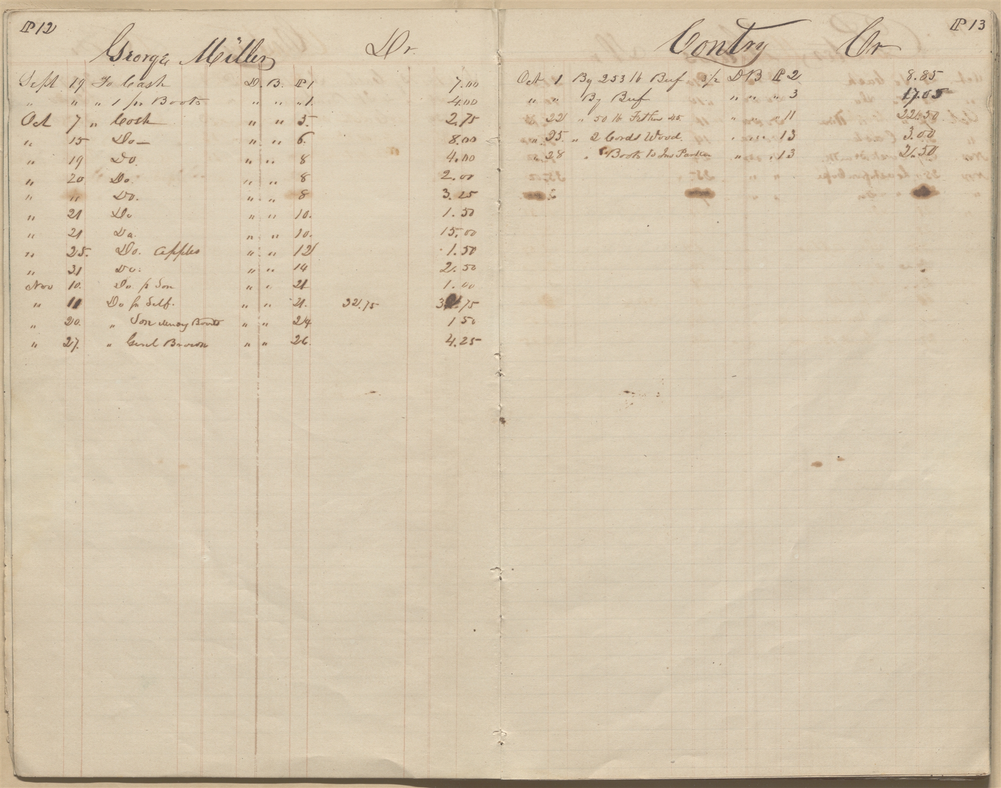 | Sept 19 | To Cash | D. B. [Daybook] P[age] 1 | 7.00 | Oct 1 | By 253 lb Beef 3½ | D B P 2 | 8.85 |