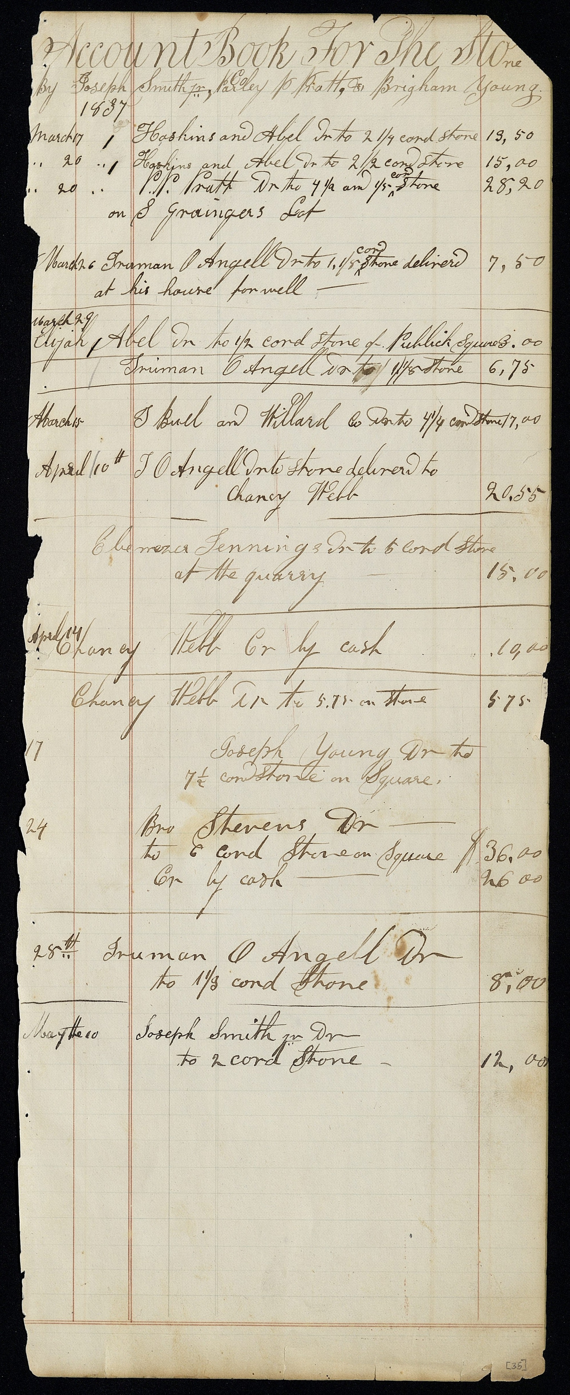 JS, , and , Stone Quarry Daybook, [, Geauga Co., OH], 17 Mar.–10 May 1837; in Brigham Young, Account Book, 1836–1846, p. [35]; handwriting of ; CHL.