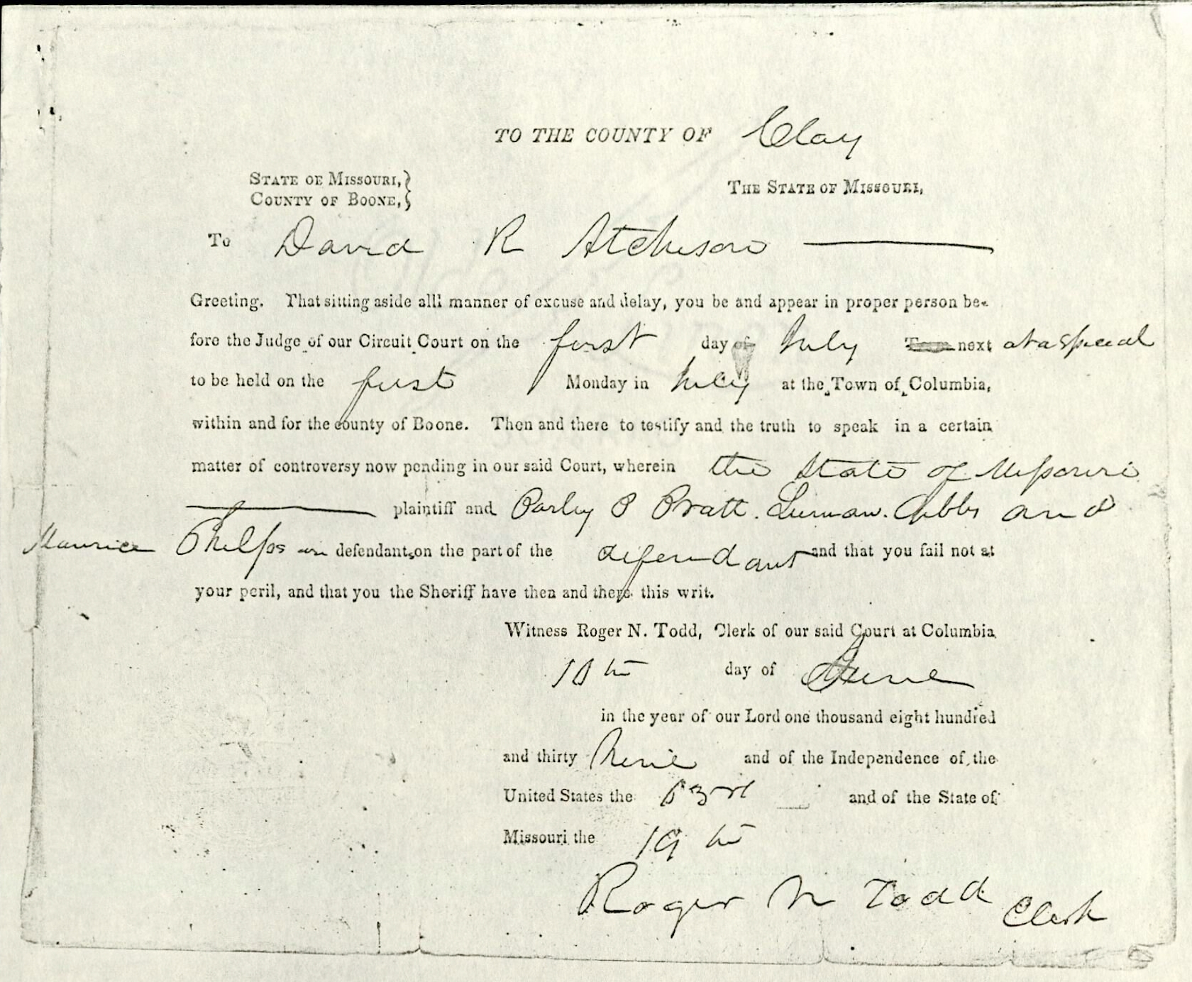 Subpoena, 10 June 1839–A [State of Missouri v. Pratt et al. for Murder]