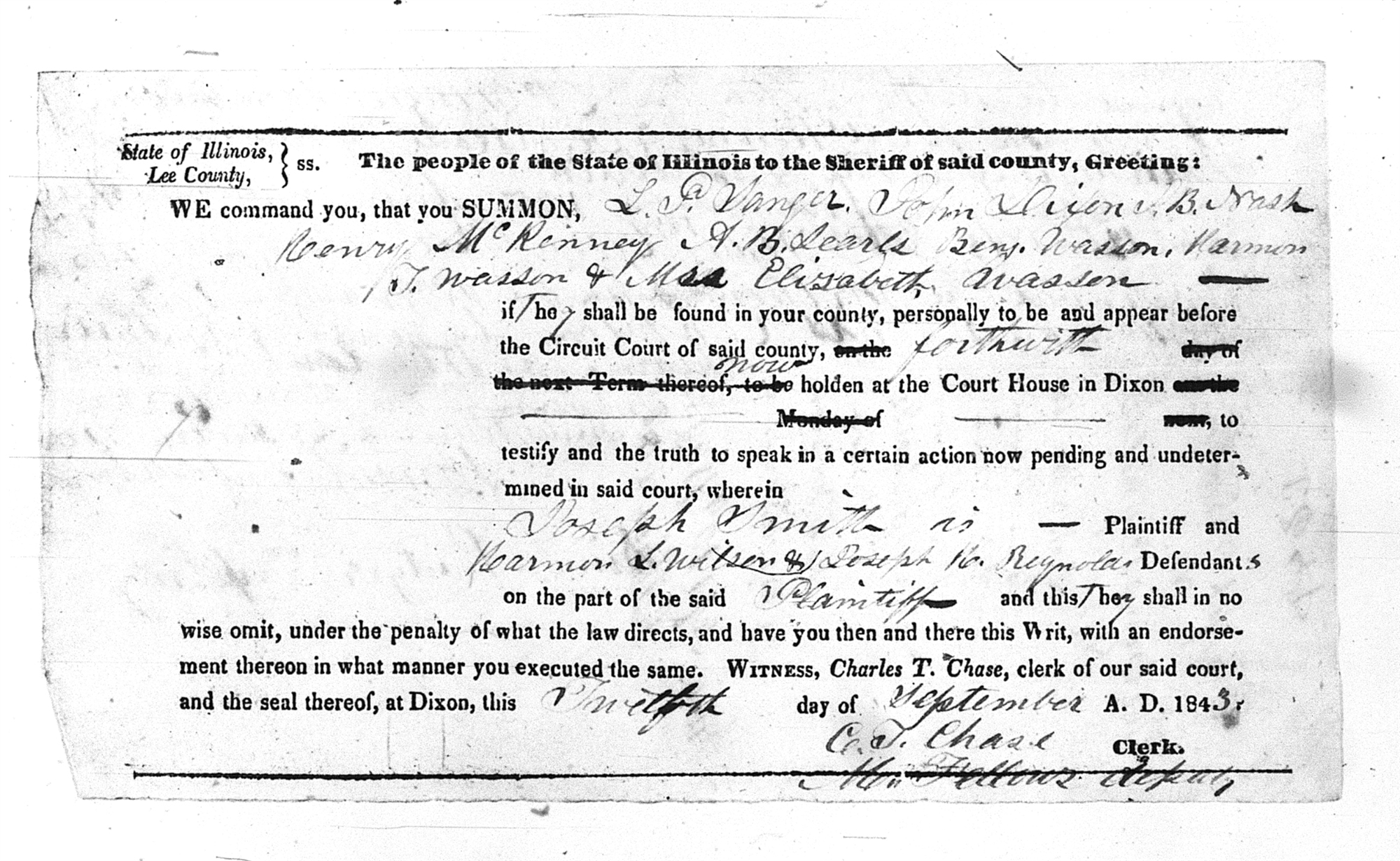WE command you, that you SUMMON, . John Dixon J[ohn] B. Nash Henry McKinney A. B. Searls [Asa B. Searles] Benj. Wasson, Harmon T. Wasson & Mrs Elizabeth [Hale] Wasson— if They shall be found in your , personally to be and appear before the Circuit Court of said , on the forthwith day of the next Term thereof, to be now holden at the Court House in on the [blank] Monday of [blank] next, to testify and the truth to speak in a certain action now pending and undetermined in said court, wherein Joseph Smith is— Plaintiff and & Defendants on the part of the said Plaintiff and this They shall in no wise omit, under the penalty of what the law directs, and have you then and there this Writ, with an endorsement thereon in what manner you executed the same. Witness, Charles T. Chase, clerk of our said court, and the seal thereof, at , this Twelfth day of September A. D. 1843.