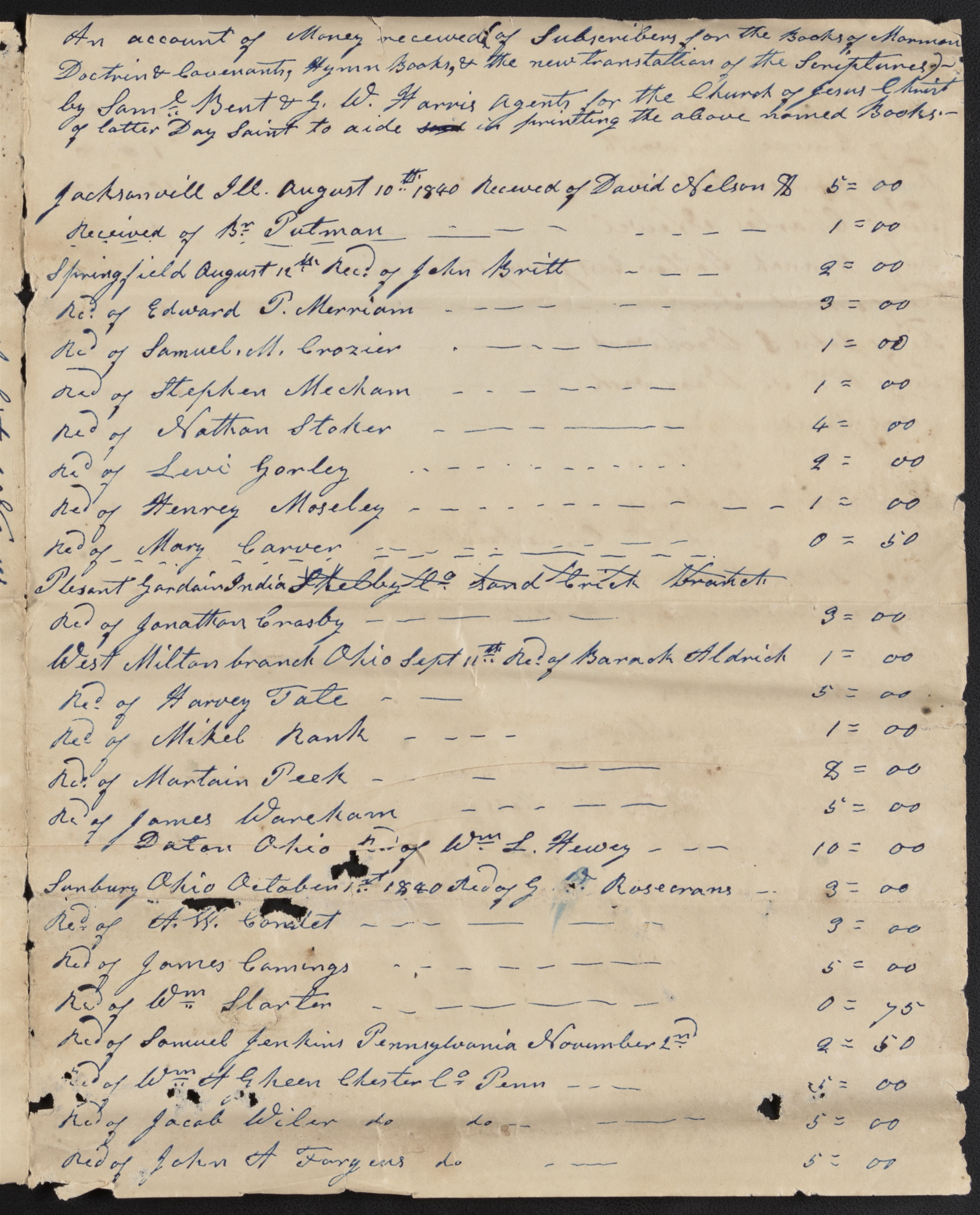 An account of Money received (of Subscribers for the Books of Mormon Doctrin & Covenants, Hymn Books, & the new translation of the Scriptures)— by & Agents for the Church of Jesus Christ of latter Day Saint to aide said in printing the above named Books.—