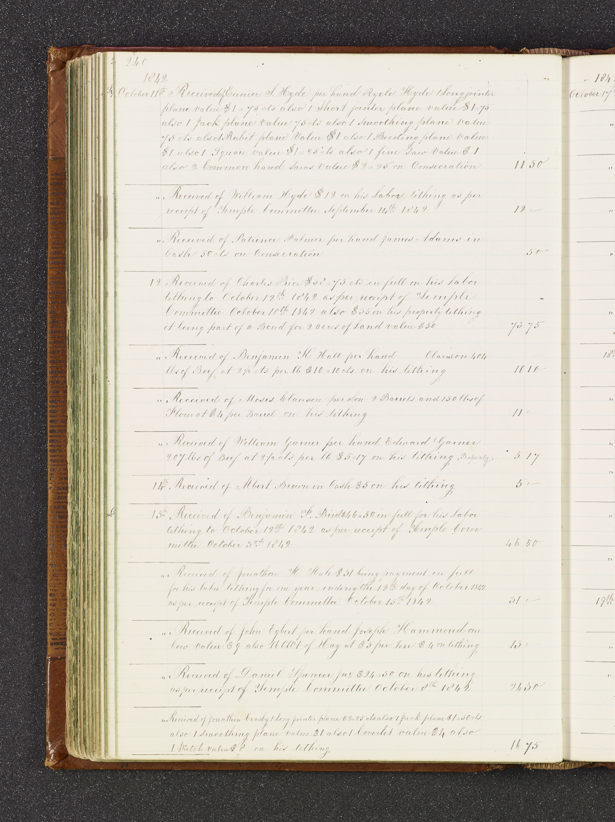 | 15th. | Received of $46.50 in full for his Labor tithing to October 12th. 1842 as per receipt of October 3rd. 1842 | $46.50 |