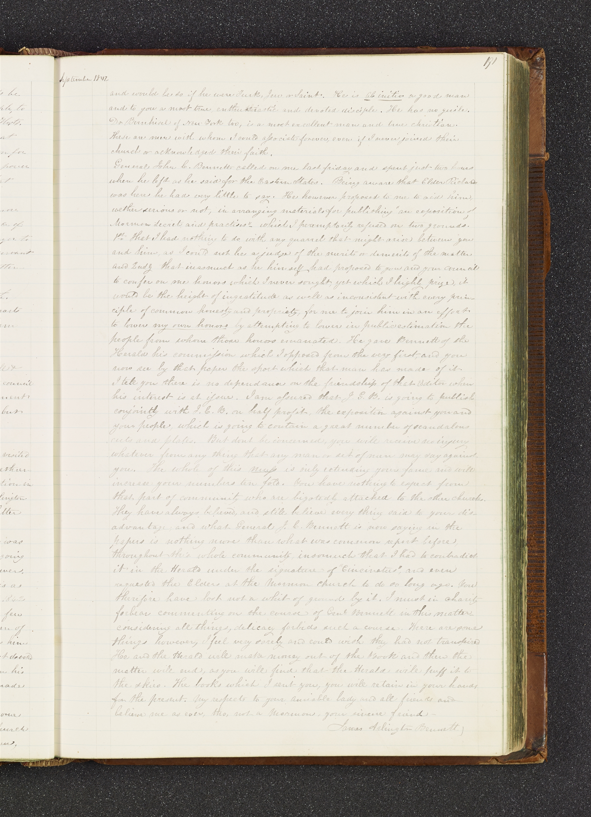 The journal portion of the Book of the Law of the Lord comprises a little less than 20 percent of the volume and covers the period 11 December 1841 to 20 December 1842. This material was recorded by , , , and . To view images and transcripts of the journal entries, along with detailed annotation, see Journal, December 1841–December 1842; the entries are also published in full in Journals, Volume 2.