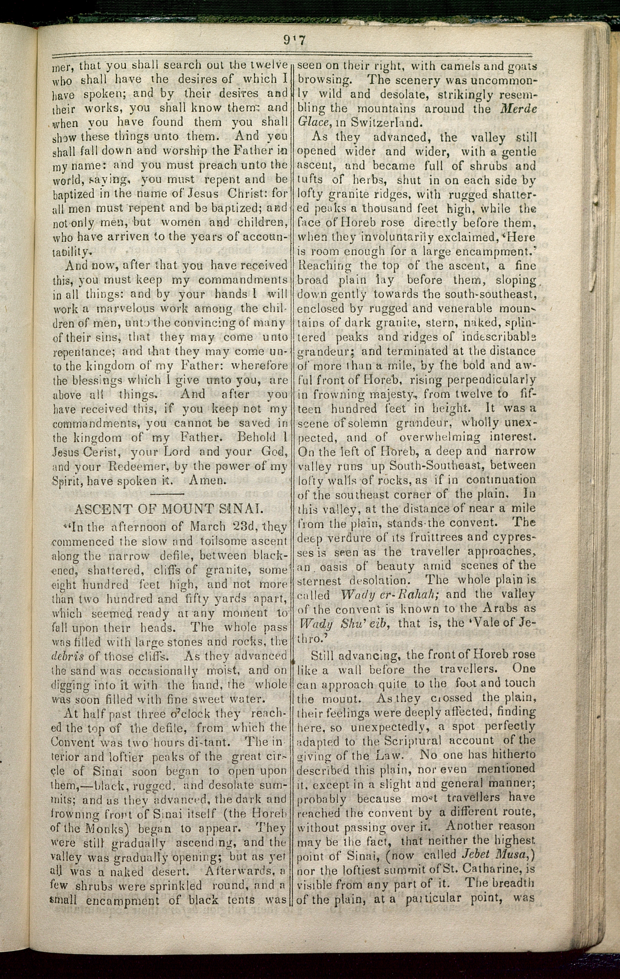 Still advancing, the front of Horeb rose like a wall before the travellers. One can approach quite to the foot and touch the mount. As they crossed the plain, their feelings were deeply affected, finding here, so unexpectedly, a spot perfectly adapted to the Scriptural account of the giving of the Law. No one has hitherto described this plain, nor even mentioned it, except in a slight and general manner; probably because most travellers have reached the convent by a different route, without passing over it. Another reason may be the fact, that neither the highest point of Sinai, (now called Jebet Musa,) nor the loftiest summit of St. Catharine, is visible from any part of it. The breadth of the plain, at a particular point, was [p. 917]