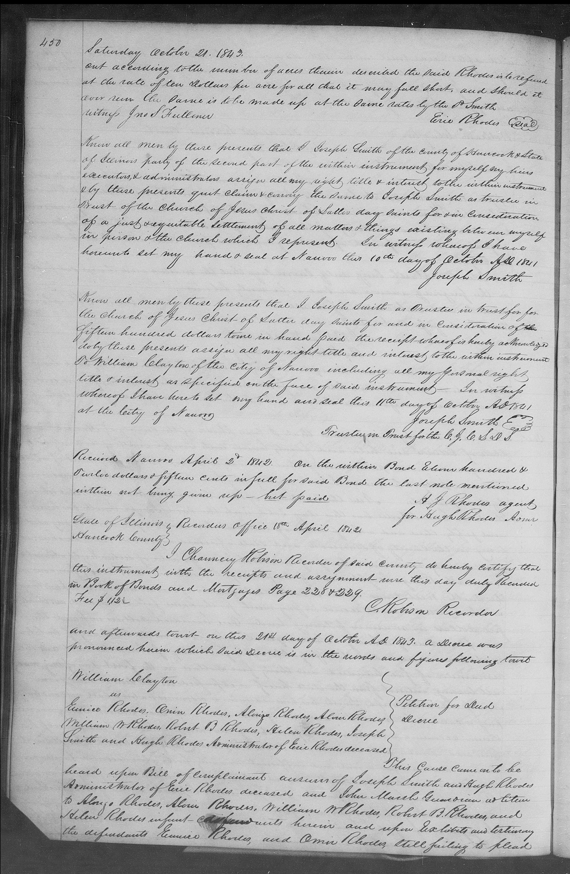 Transcript of Proceedings, [, Hancock Co., IL, between 21 Oct. 1843 and 6 Feb. 1844], Clayton v. E. W. Rhodes et al. (Hancock Co., IL, Circuit Court, in 1843); Hancock County Circuit Court, Chancery Court Records, 1838–1924, vol. B, pp. 444–451; handwriting of ; Hancock County Courthouse, Carthage, IL; microfilm at FHL.