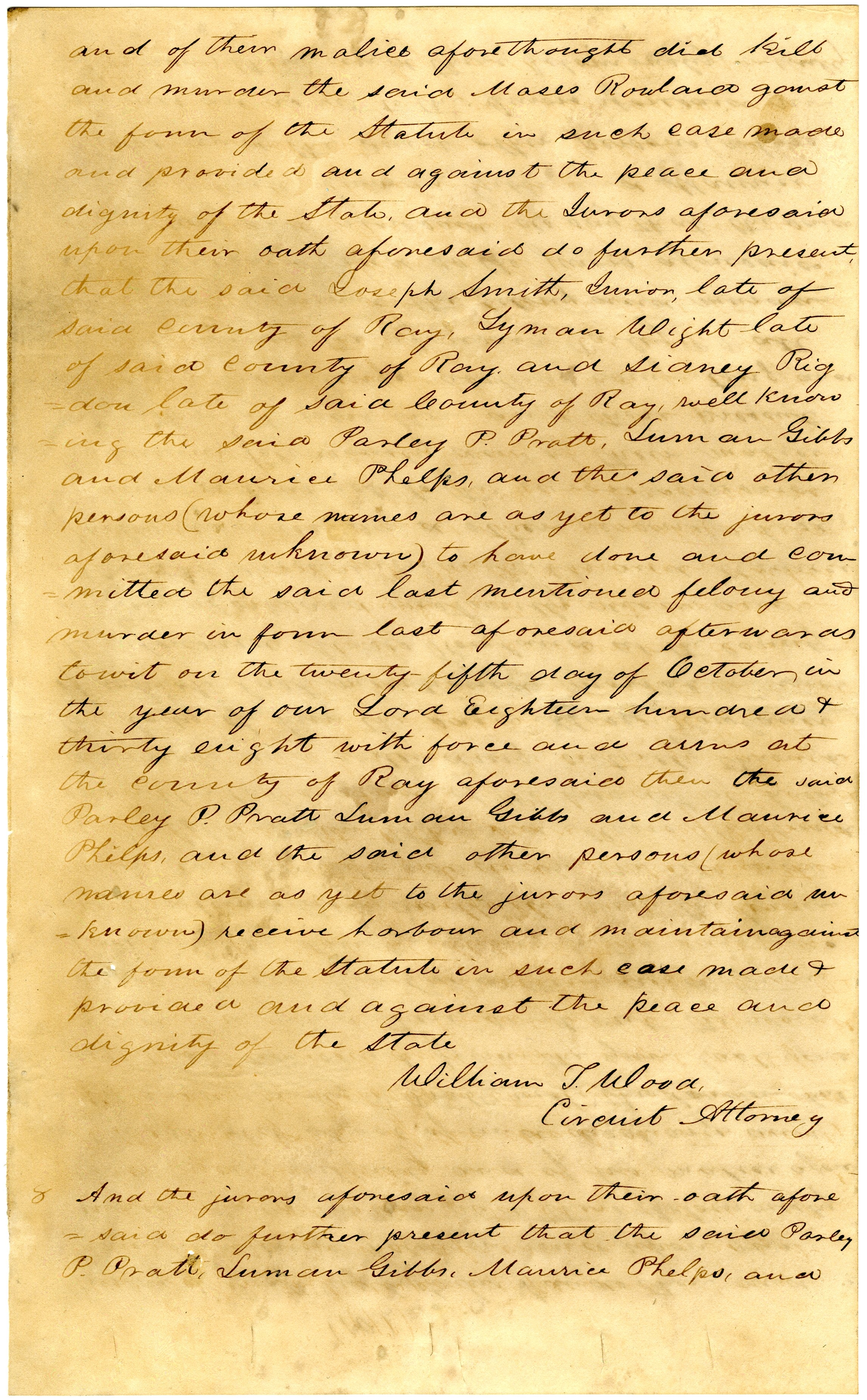 and of their malice aforethought did kill and murder the said Moses Rowland gainst the form of the Statute in such case made and provided and against the peace and dignity of the , and the Jurors aforesaid upon their oath aforesaid do further present, that the said Joseph Smith, Junior, late of said county of , late of said county of , and late of said County of , well knowing the said , and Maurice Phelps, and the said other persons (whose names are as yet to the jurors aforesaid unknown) to have done and committed the said last mentioned felony and murder in form last aforesaid afterwards to wit on the twenty-fifth day of October, in the year of our Lord Eighteen hundred & thirty eiight with force and arms at the county of aforesaid then the said and Maurice Phelps, and the said other persons (whose names are as yet to the jurors aforesaid unknown) receive harbour and maintain against the form of the Statute in such case made & provided and against the peace and dignity of the
