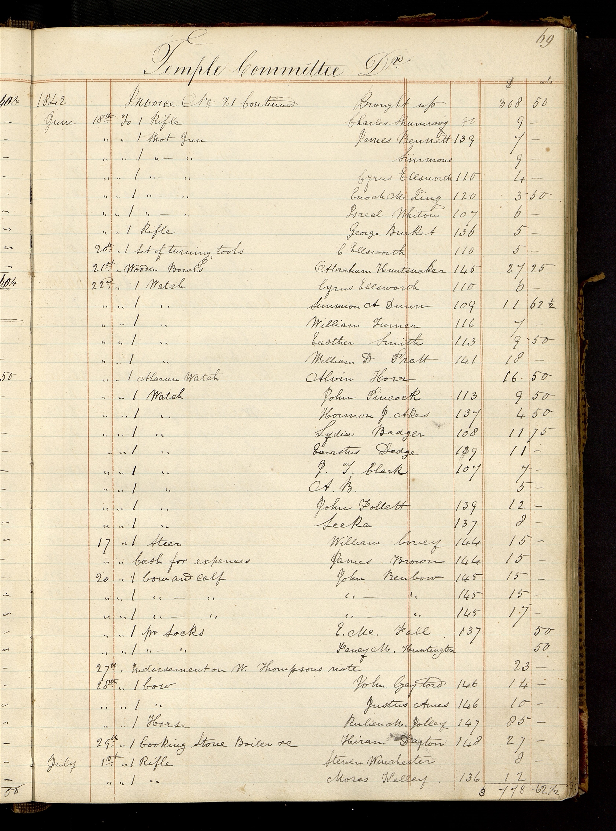Trustee-in-Trust, Ledger A, 7–82. Two incomplete loose copies of “Invoice No 31” are extant and in the records of the Nauvoo temple committee. (Invoice, Trustee-in-Trust to Nauvoo Temple Committee, 24 Nov. 1842–8 Feb. 1843; Invoice, Trustee-in-Trust to Nauvoo Temple Committee, 24 Nov. 1842–25 July 1843.)