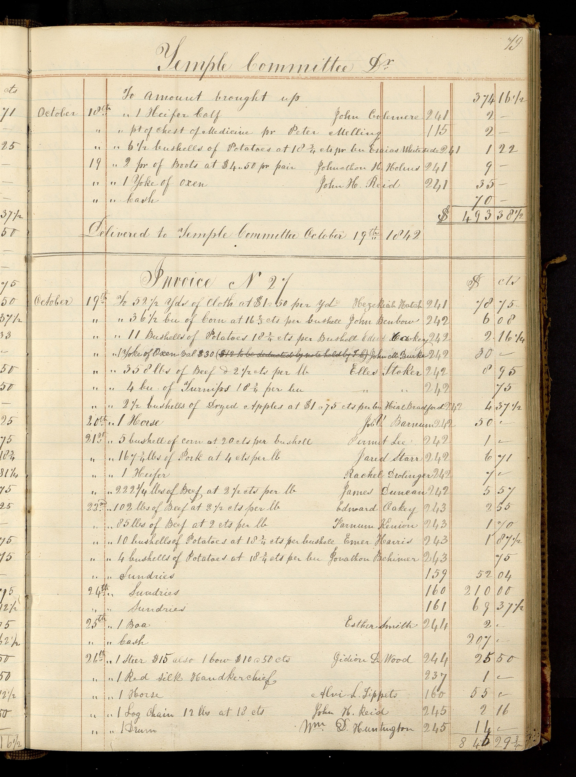 Trustee-in-Trust, Ledger A, 7–82. Two incomplete loose copies of “Invoice No 31” are extant and in the records of the Nauvoo temple committee. (Invoice, Trustee-in-Trust to Nauvoo Temple Committee, 24 Nov. 1842–8 Feb. 1843; Invoice, Trustee-in-Trust to Nauvoo Temple Committee, 24 Nov. 1842–25 July 1843.)