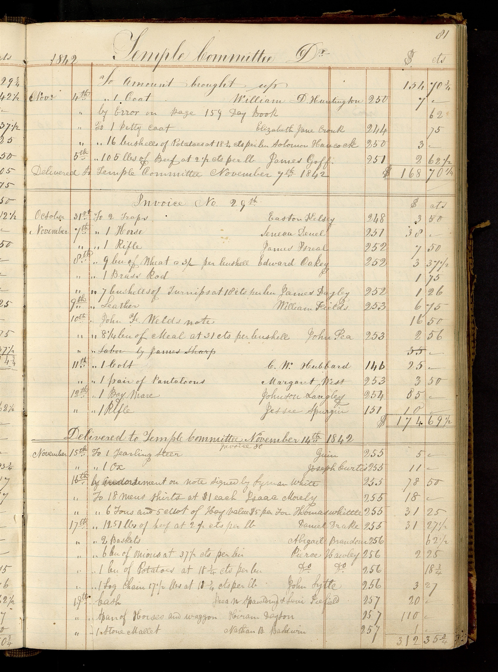 Trustee-in-Trust, Ledger A, 7–82. Two incomplete loose copies of “Invoice No 31” are extant and in the records of the Nauvoo temple committee. (Invoice, Trustee-in-Trust to Nauvoo Temple Committee, 24 Nov. 1842–8 Feb. 1843; Invoice, Trustee-in-Trust to Nauvoo Temple Committee, 24 Nov. 1842–25 July 1843.)