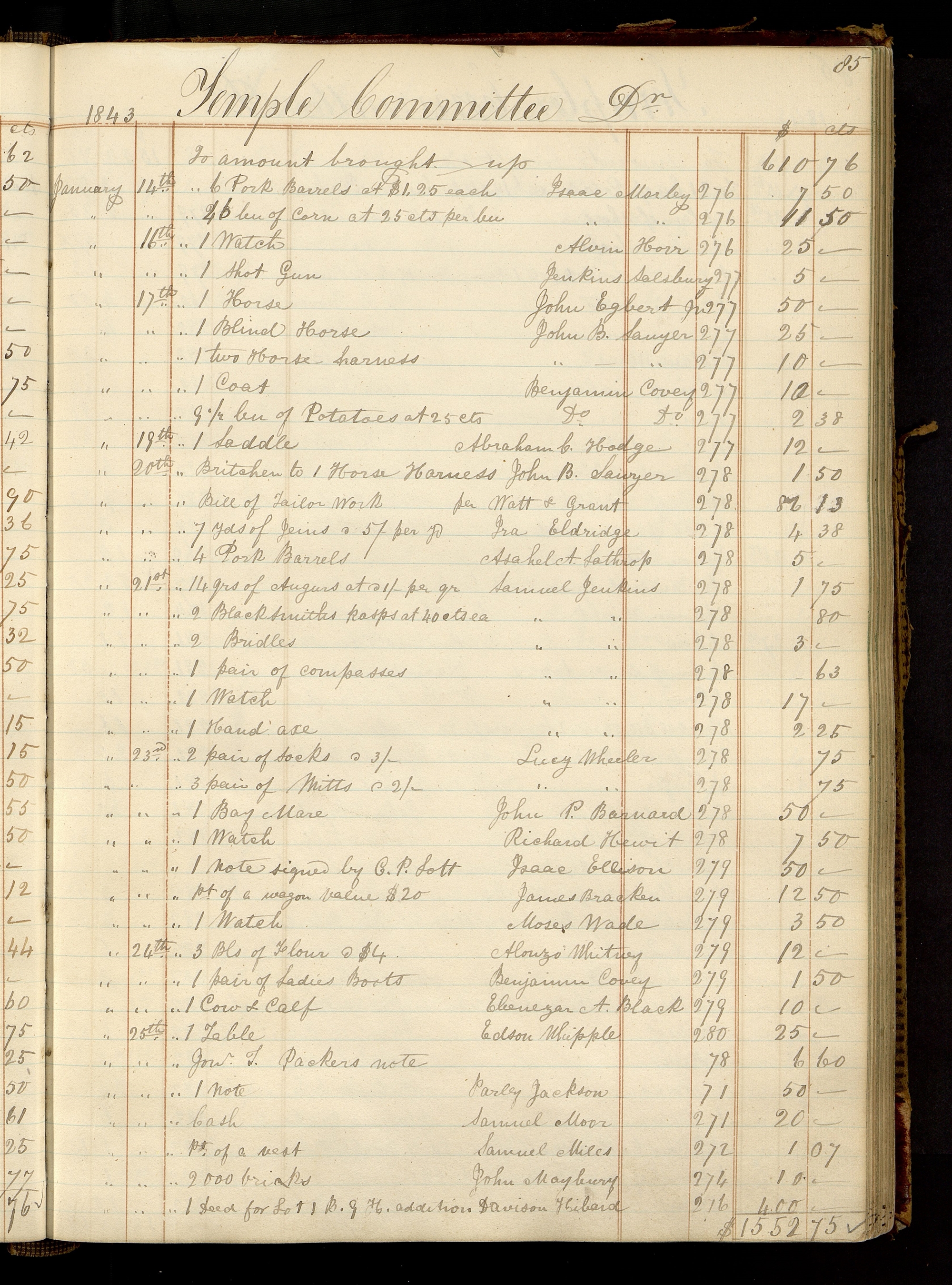 Trustee-in-Trust, Ledger A, 7–82. Two incomplete loose copies of “Invoice No 31” are extant and in the records of the Nauvoo temple committee. (Invoice, Trustee-in-Trust to Nauvoo Temple Committee, 24 Nov. 1842–8 Feb. 1843; Invoice, Trustee-in-Trust to Nauvoo Temple Committee, 24 Nov. 1842–25 July 1843.)
