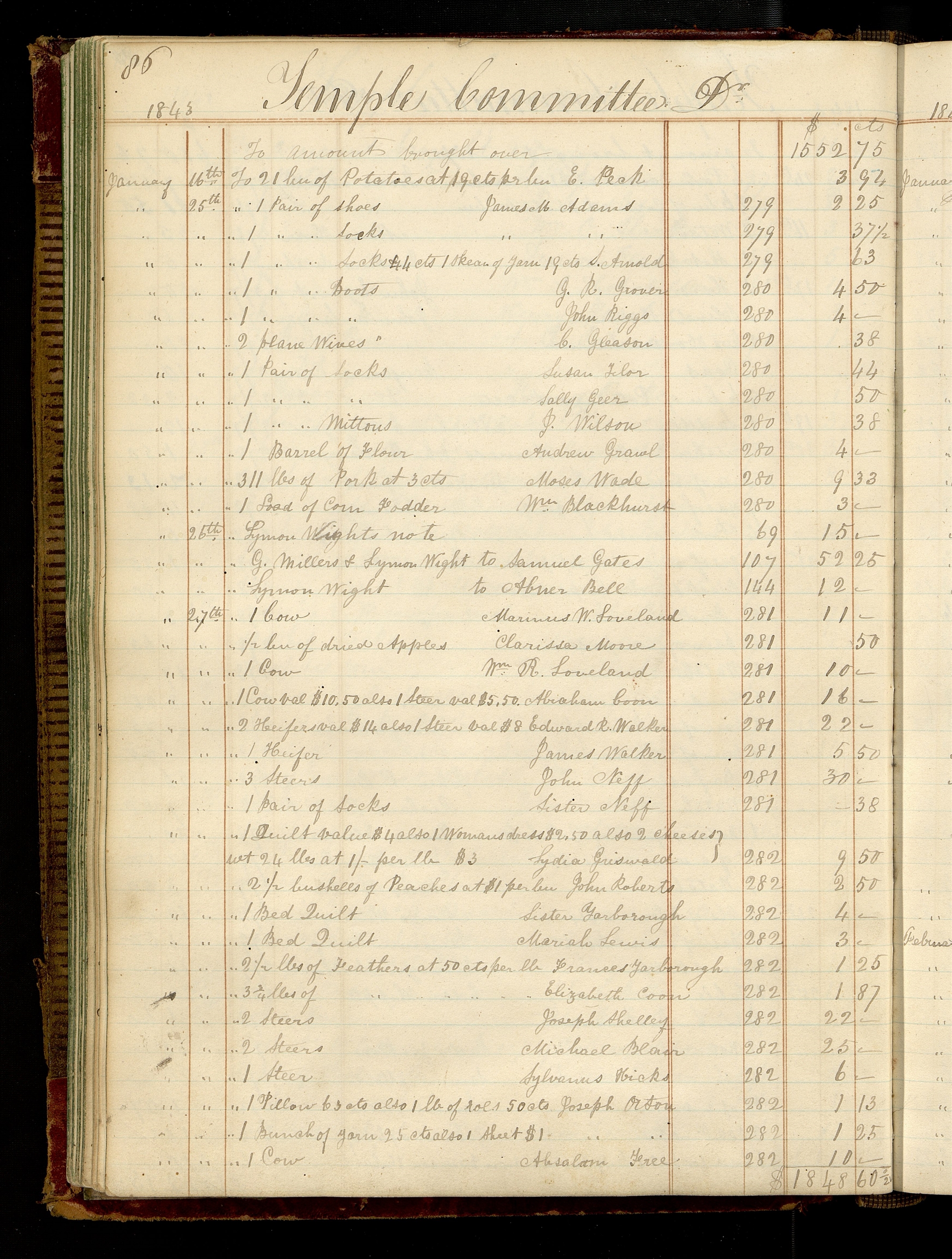 This likely led to the inscription of “Temple Committee Book A” on the spine of the volume. Some have mistaken this as an indication that this record book belonged to the Nauvoo temple committee; however, these are not temple committee records but rather accounts between the trustee-in-trust office and the Nauvoo temple committee.