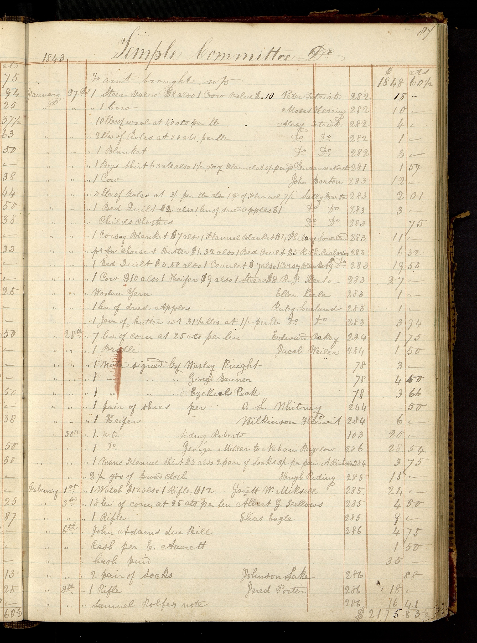 | [January 27th.] | [To] p[ar]t for cheese & Butter $1.32 also 1 Bed Quilt $5.00 | R[uth Richards] & E[lsey] Richards | 283 | 6.32 |