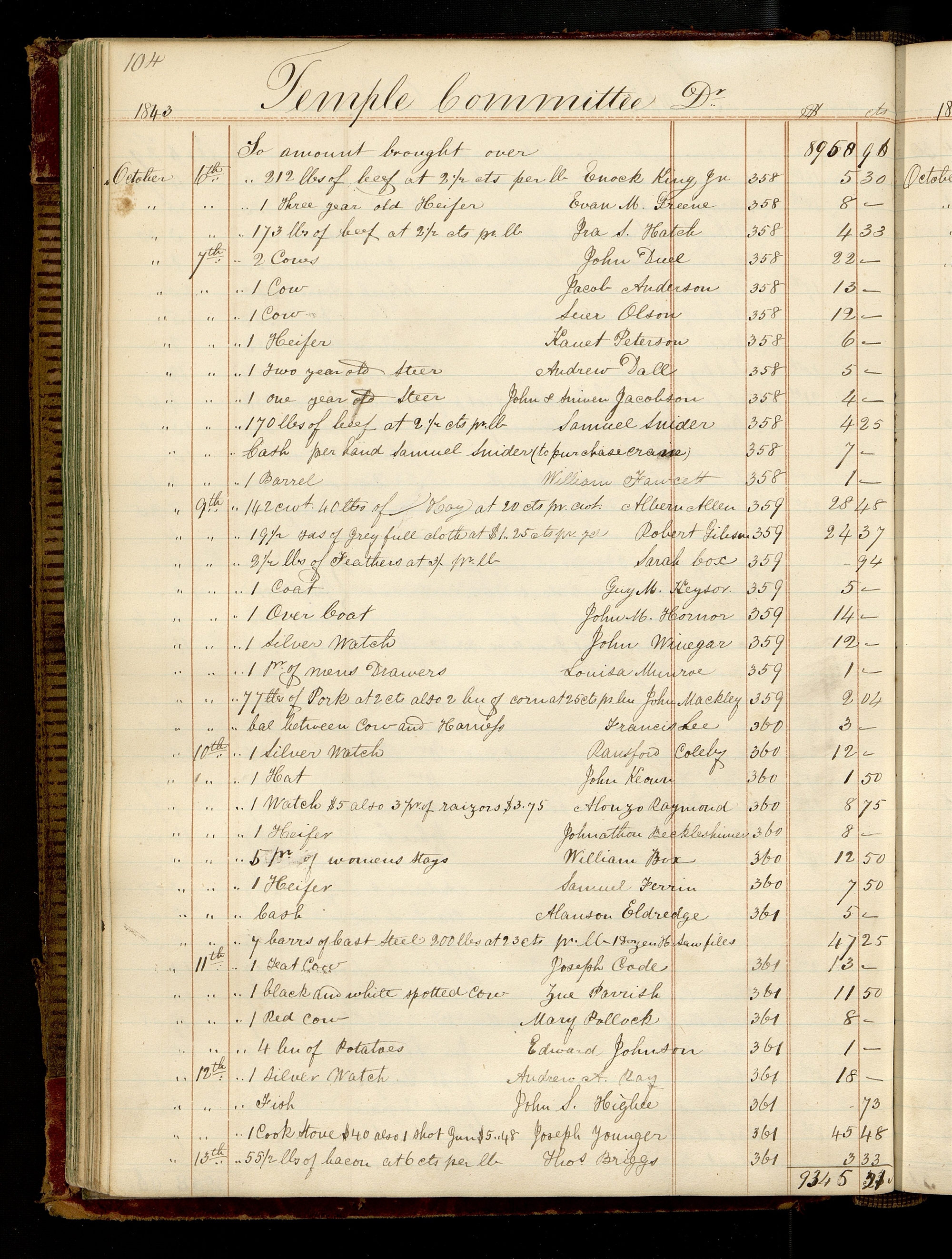 This likely led to the inscription of “Temple Committee Book A” on the spine of the volume. Some have mistaken this as an indication that this record book belonged to the Nauvoo temple committee; however, these are not temple committee records but rather accounts between the trustee-in-trust office and the Nauvoo temple committee.