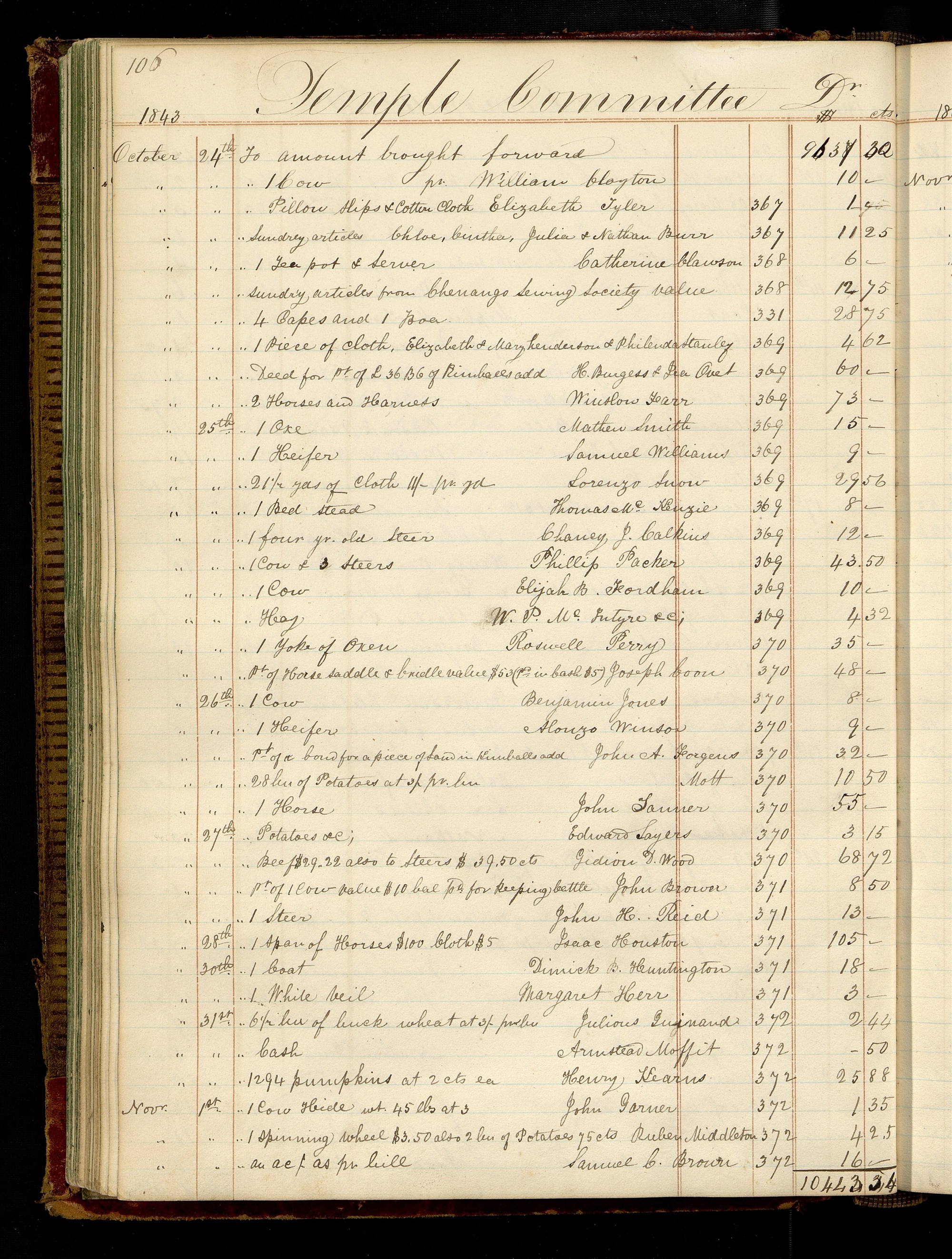 This likely led to the inscription of “Temple Committee Book A” on the spine of the volume. Some have mistaken this as an indication that this record book belonged to the Nauvoo temple committee; however, these are not temple committee records but rather accounts between the trustee-in-trust office and the Nauvoo temple committee.