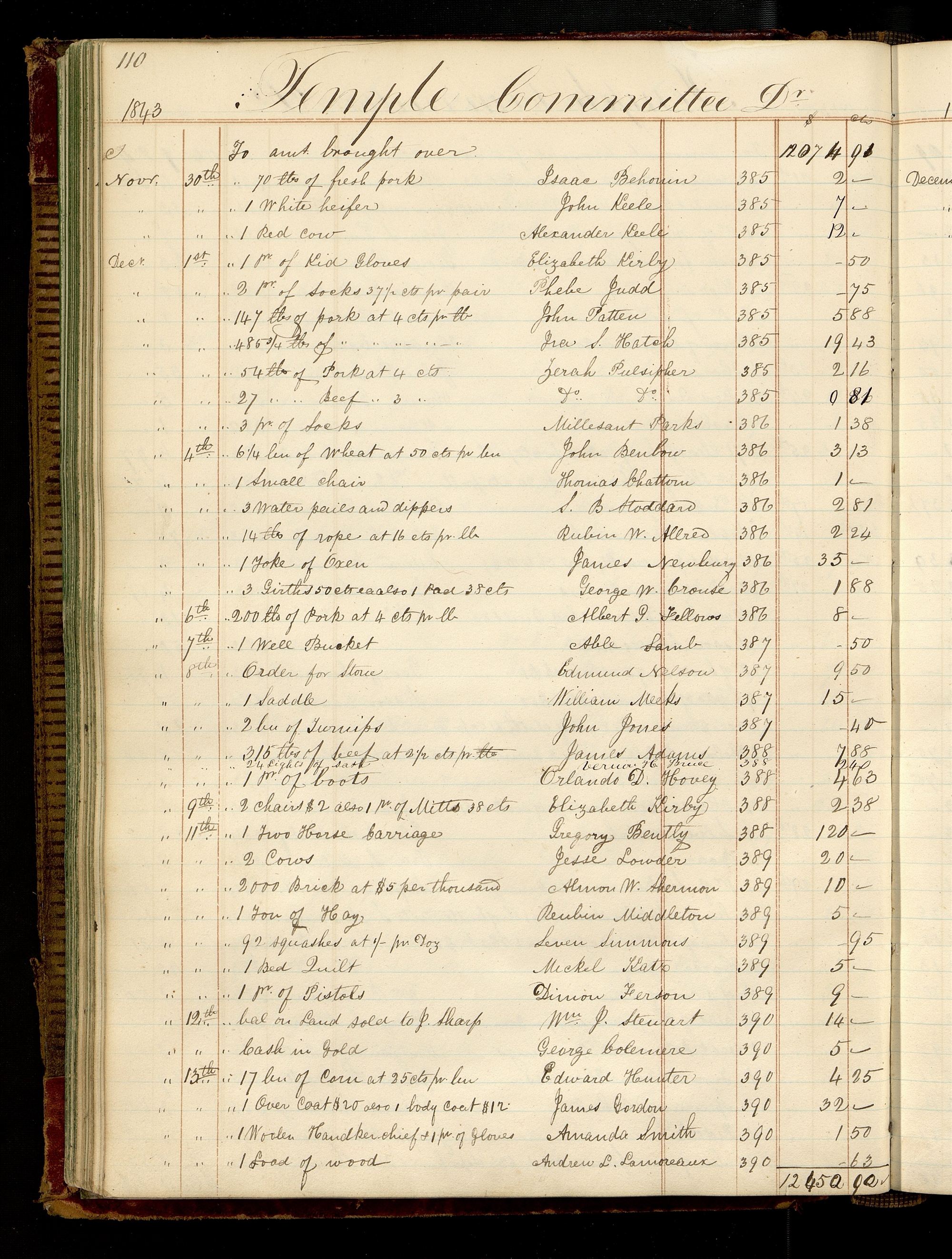 This likely led to the inscription of “Temple Committee Book A” on the spine of the volume. Some have mistaken this as an indication that this record book belonged to the Nauvoo temple committee; however, these are not temple committee records but rather accounts between the trustee-in-trust office and the Nauvoo temple committee.