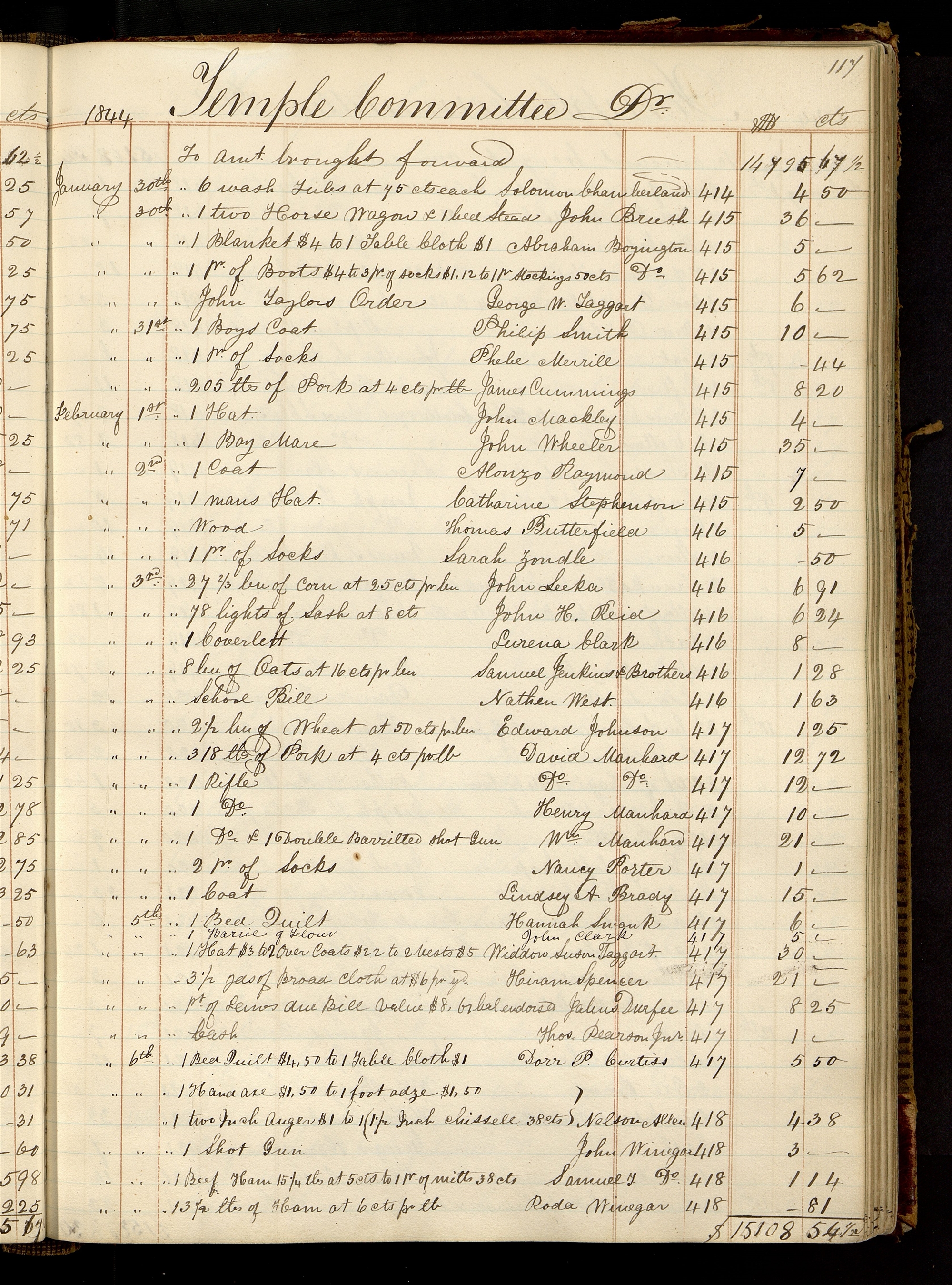 This likely led to the inscription of “Temple Committee Book A” on the spine of the volume. Some have mistaken this as an indication that this record book belonged to the Nauvoo temple committee; however, these are not temple committee records but rather accounts between the trustee-in-trust office and the Nauvoo temple committee.
