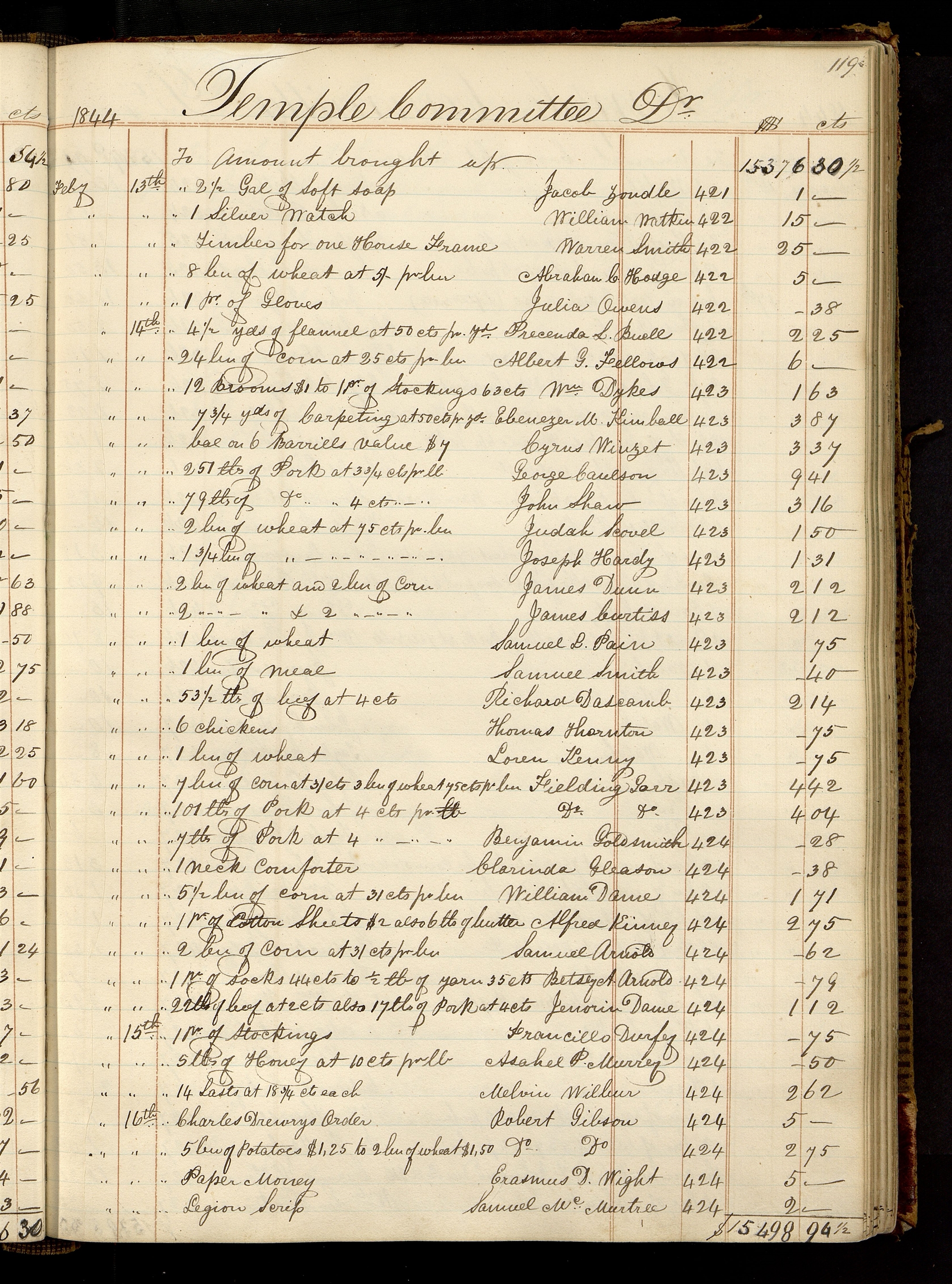 This likely led to the inscription of “Temple Committee Book A” on the spine of the volume. Some have mistaken this as an indication that this record book belonged to the Nauvoo temple committee; however, these are not temple committee records but rather accounts between the trustee-in-trust office and the Nauvoo temple committee.