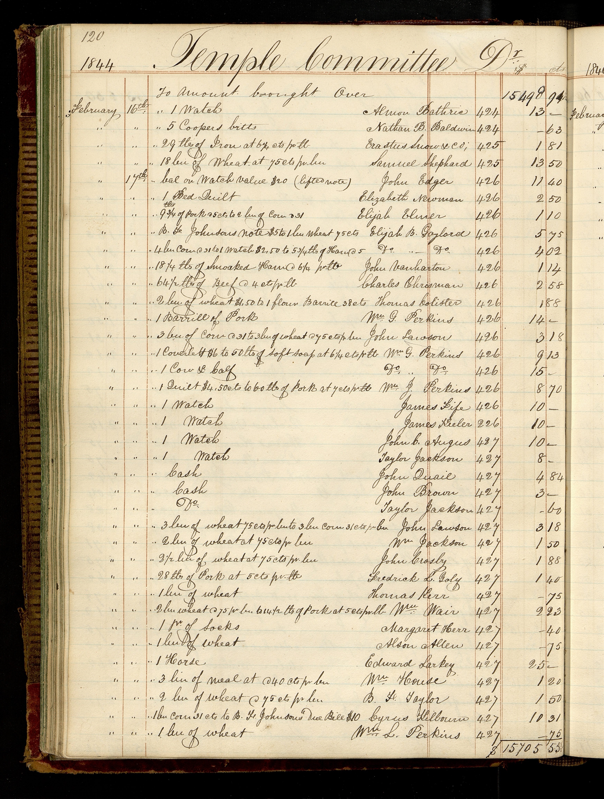 This likely led to the inscription of “Temple Committee Book A” on the spine of the volume. Some have mistaken this as an indication that this record book belonged to the Nauvoo temple committee; however, these are not temple committee records but rather accounts between the trustee-in-trust office and the Nauvoo temple committee.