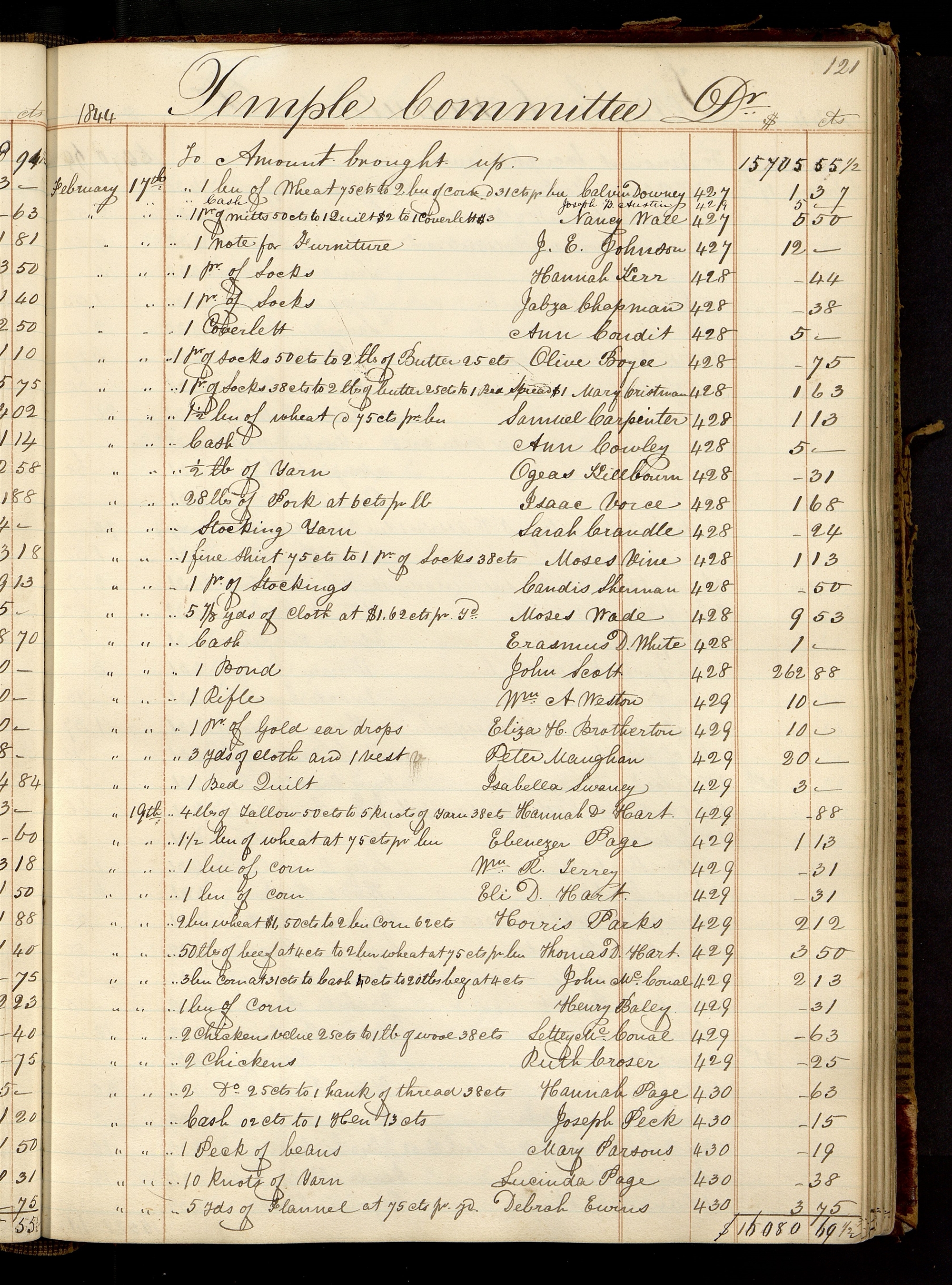 | [February 17th.] | [To] 1 pr. of Socks $0.38 to 2 lbs of butter $0.25 to 1 Bed Spread $1.00 | 428 | 1.63 | |