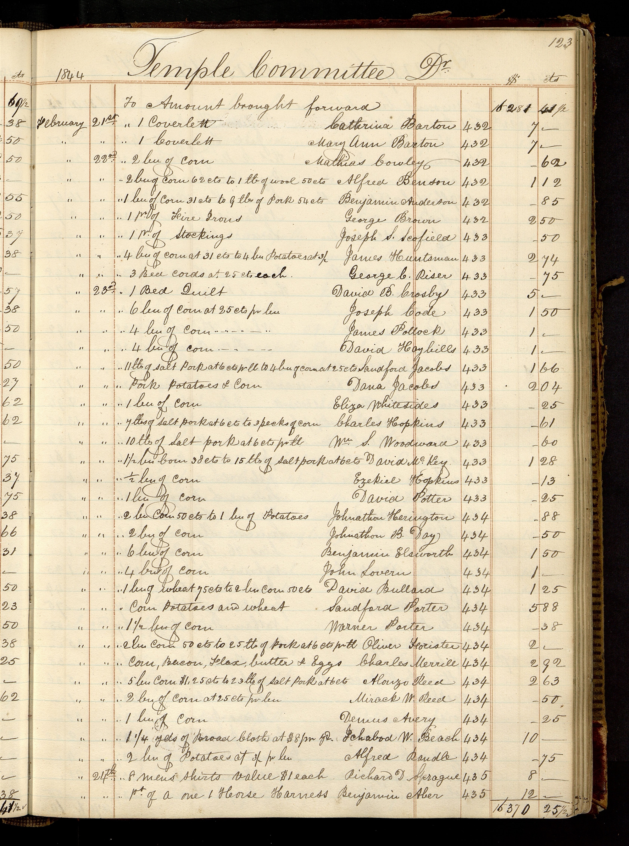 | [February 23rd.] | [To] 5 bu Corn $1.25 to 23 lbs of Salt Pork at $0.06 | Alonzo Reed | 434 | 2.63 |