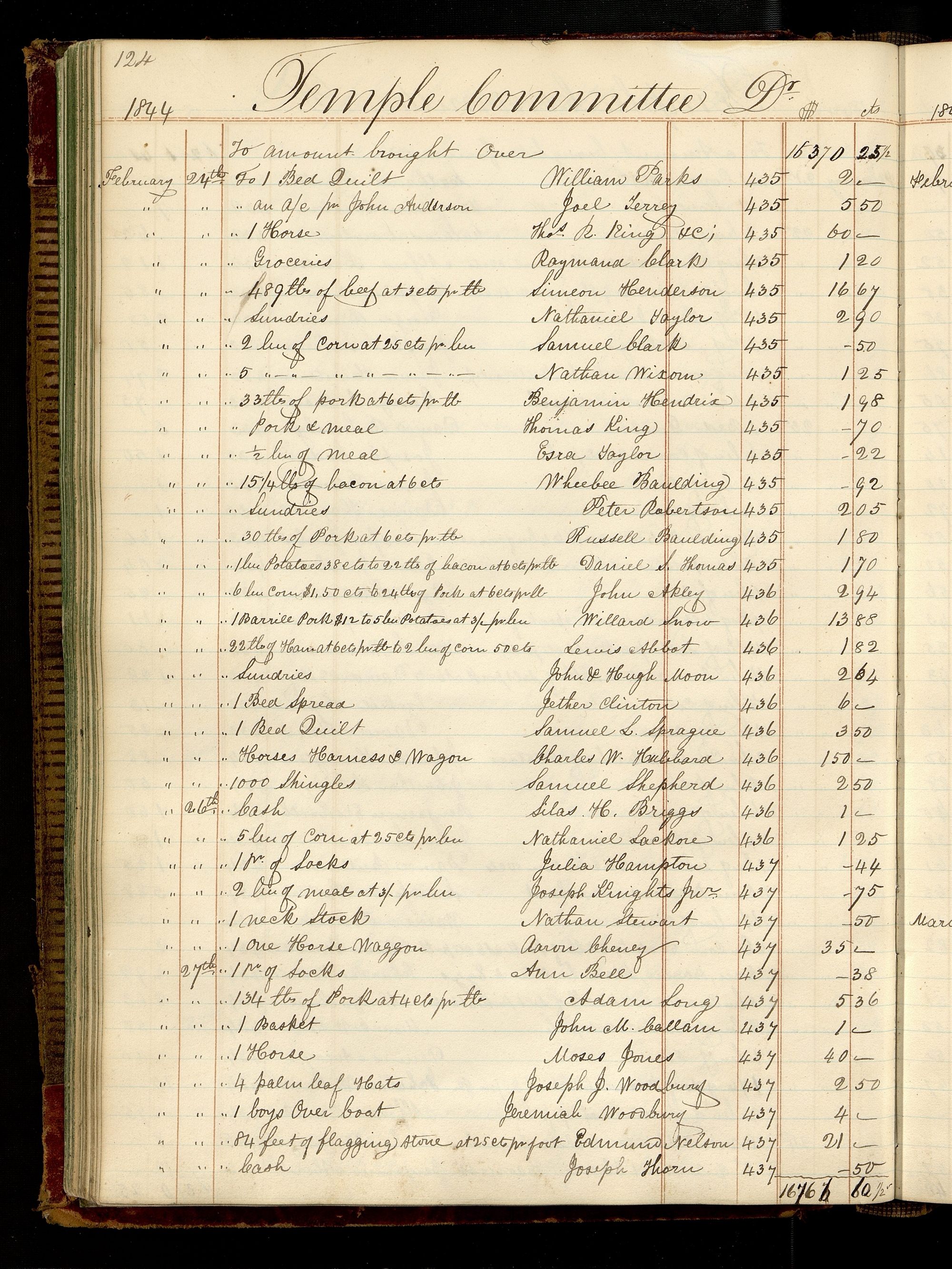 | [February 24th.] | [To] 15¼ lbs of bacon at $0.06 | Wheebee Baulding | 435 | 0.92 |