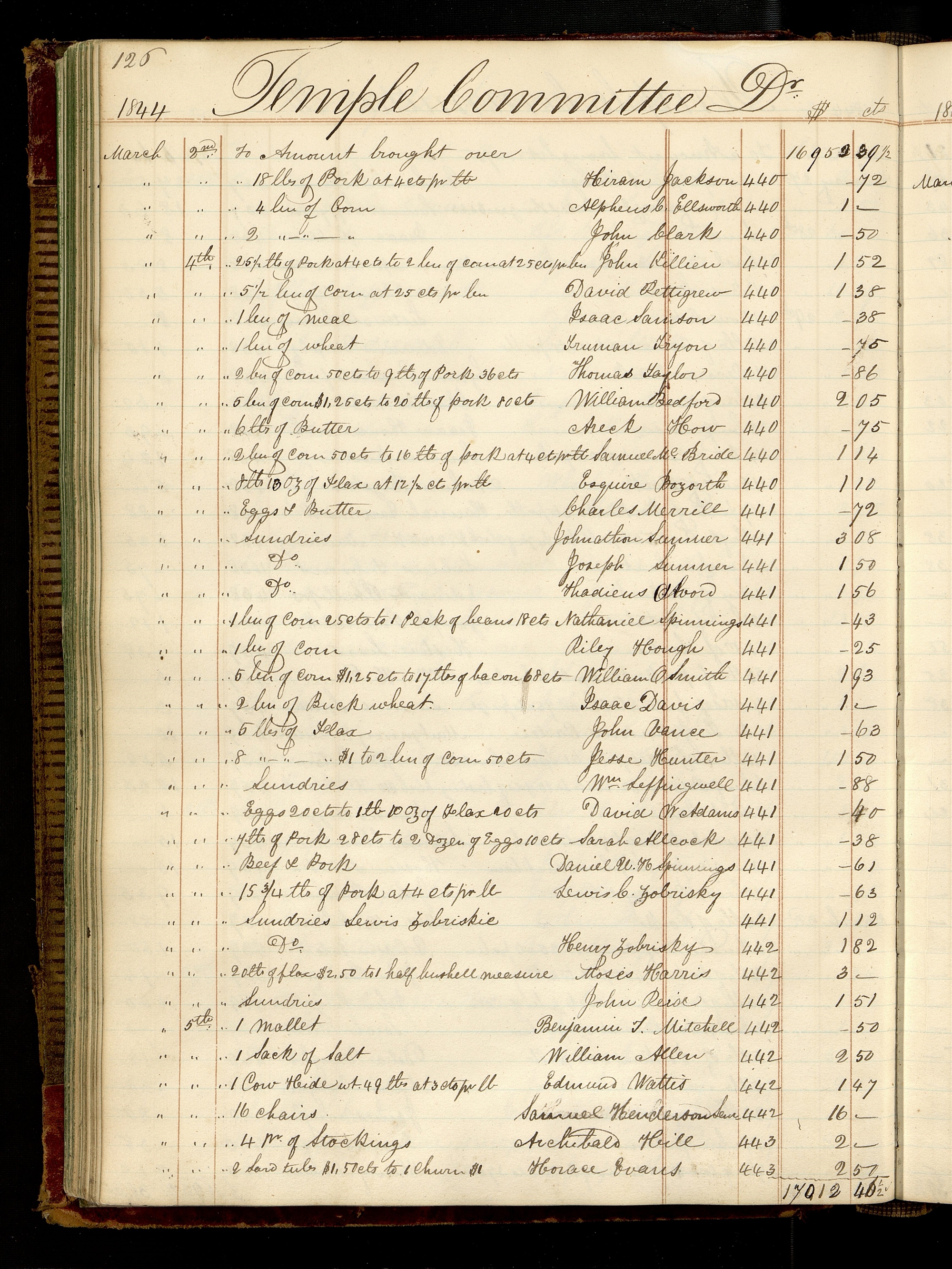 This likely led to the inscription of “Temple Committee Book A” on the spine of the volume. Some have mistaken this as an indication that this record book belonged to the Nauvoo temple committee; however, these are not temple committee records but rather accounts between the trustee-in-trust office and the Nauvoo temple committee.