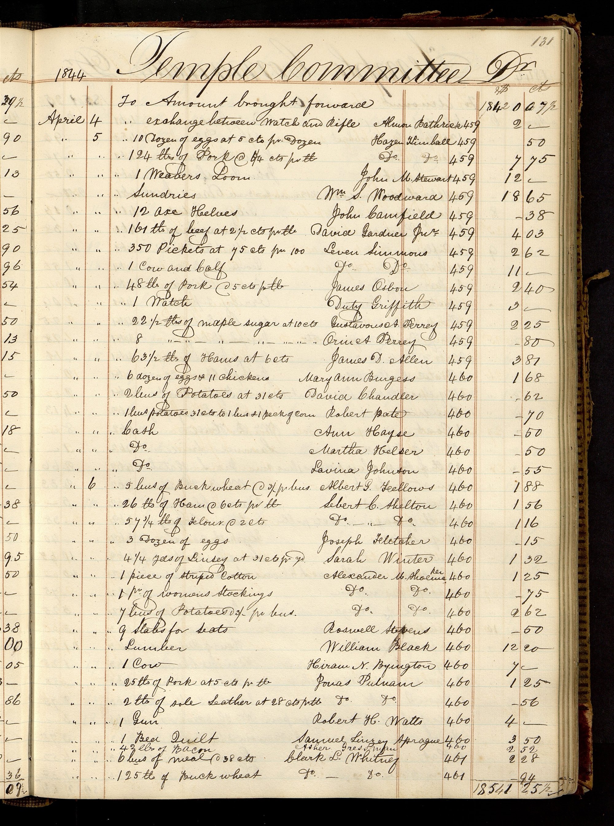 This likely led to the inscription of “Temple Committee Book A” on the spine of the volume. Some have mistaken this as an indication that this record book belonged to the Nauvoo temple committee; however, these are not temple committee records but rather accounts between the trustee-in-trust office and the Nauvoo temple committee.