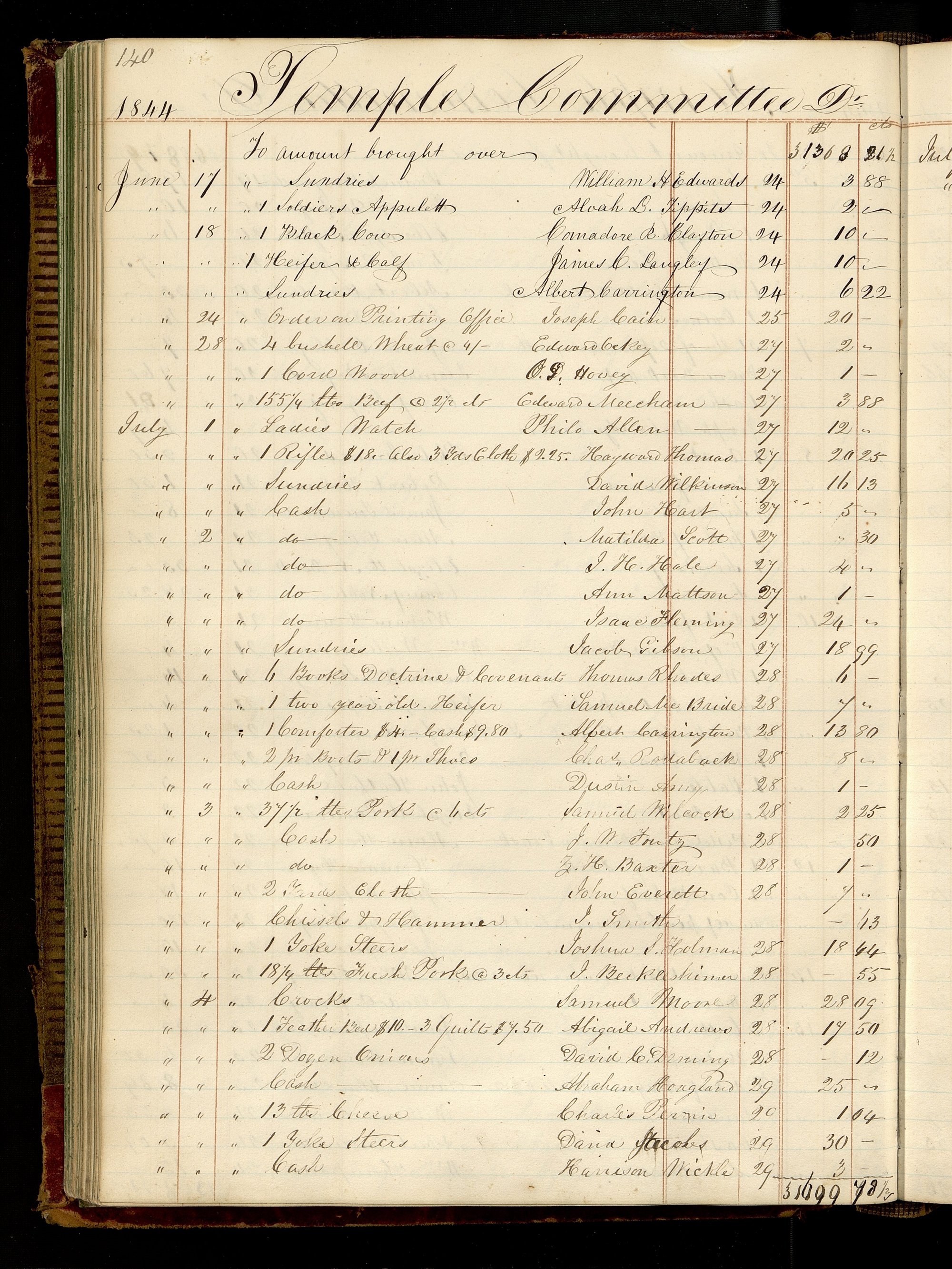 This likely led to the inscription of “Temple Committee Book A” on the spine of the volume. Some have mistaken this as an indication that this record book belonged to the Nauvoo temple committee; however, these are not temple committee records but rather accounts between the trustee-in-trust office and the Nauvoo temple committee.