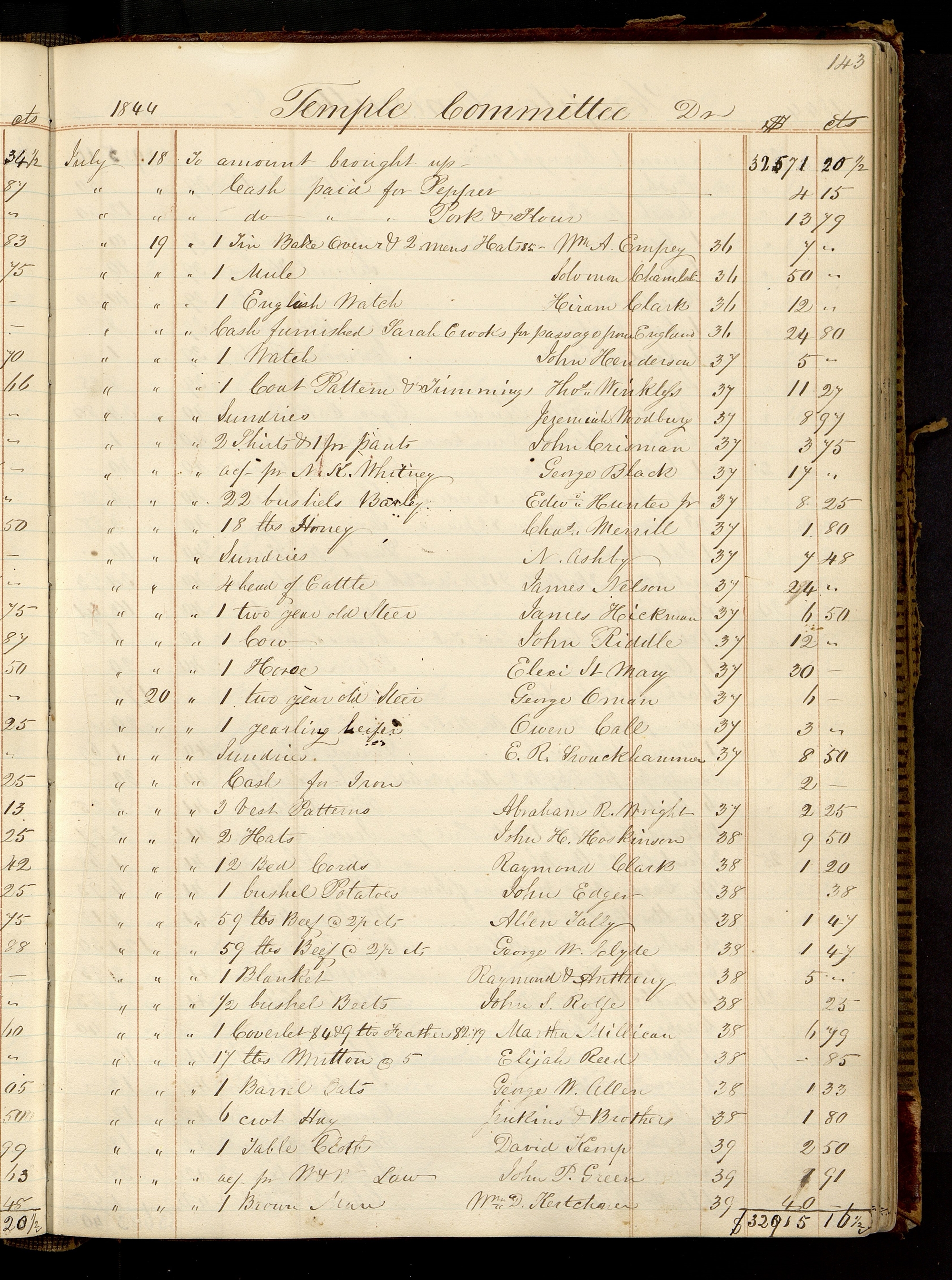 This likely led to the inscription of “Temple Committee Book A” on the spine of the volume. Some have mistaken this as an indication that this record book belonged to the Nauvoo temple committee; however, these are not temple committee records but rather accounts between the trustee-in-trust office and the Nauvoo temple committee.
