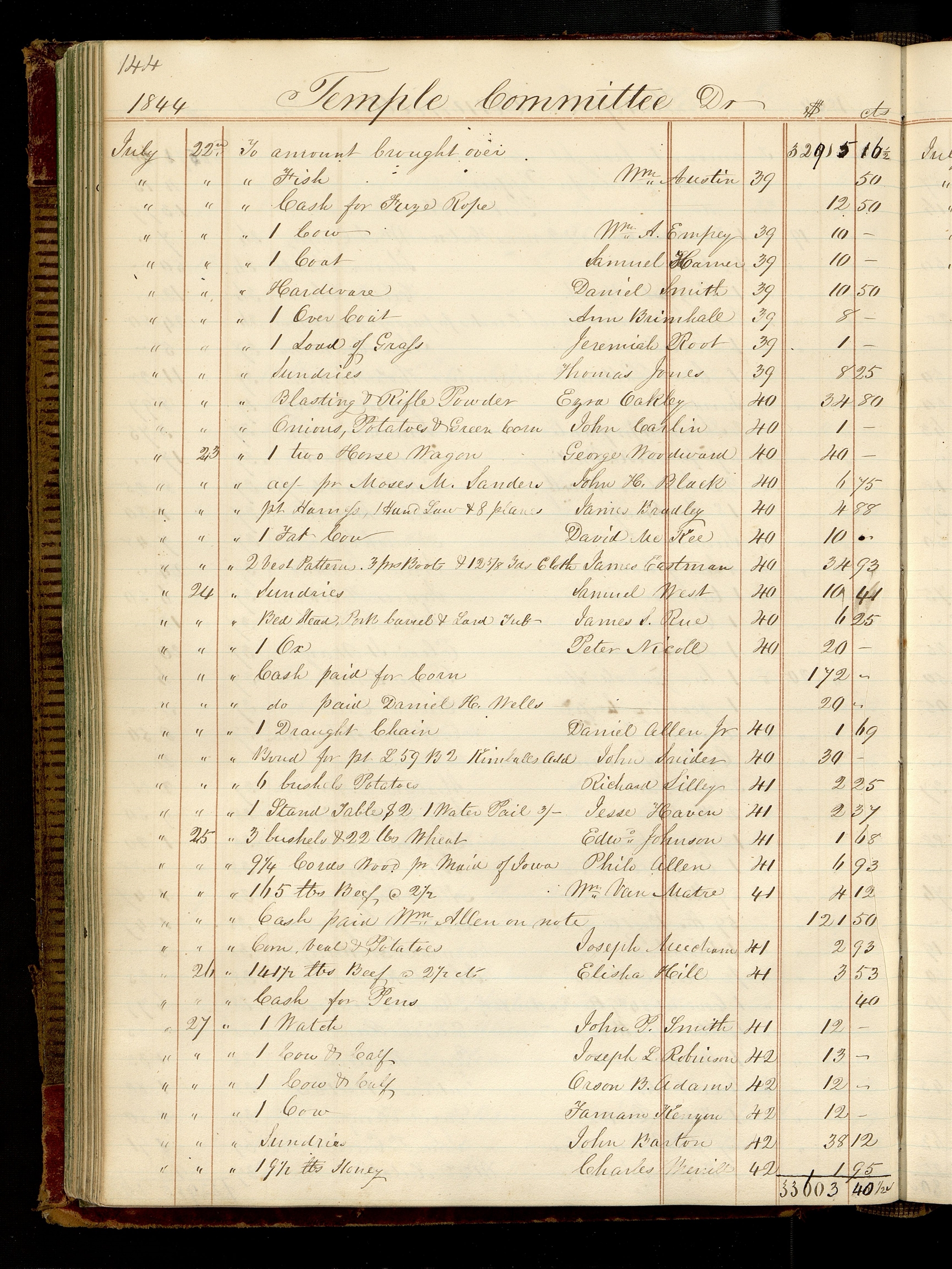 This likely led to the inscription of “Temple Committee Book A” on the spine of the volume. Some have mistaken this as an indication that this record book belonged to the Nauvoo temple committee; however, these are not temple committee records but rather accounts between the trustee-in-trust office and the Nauvoo temple committee.