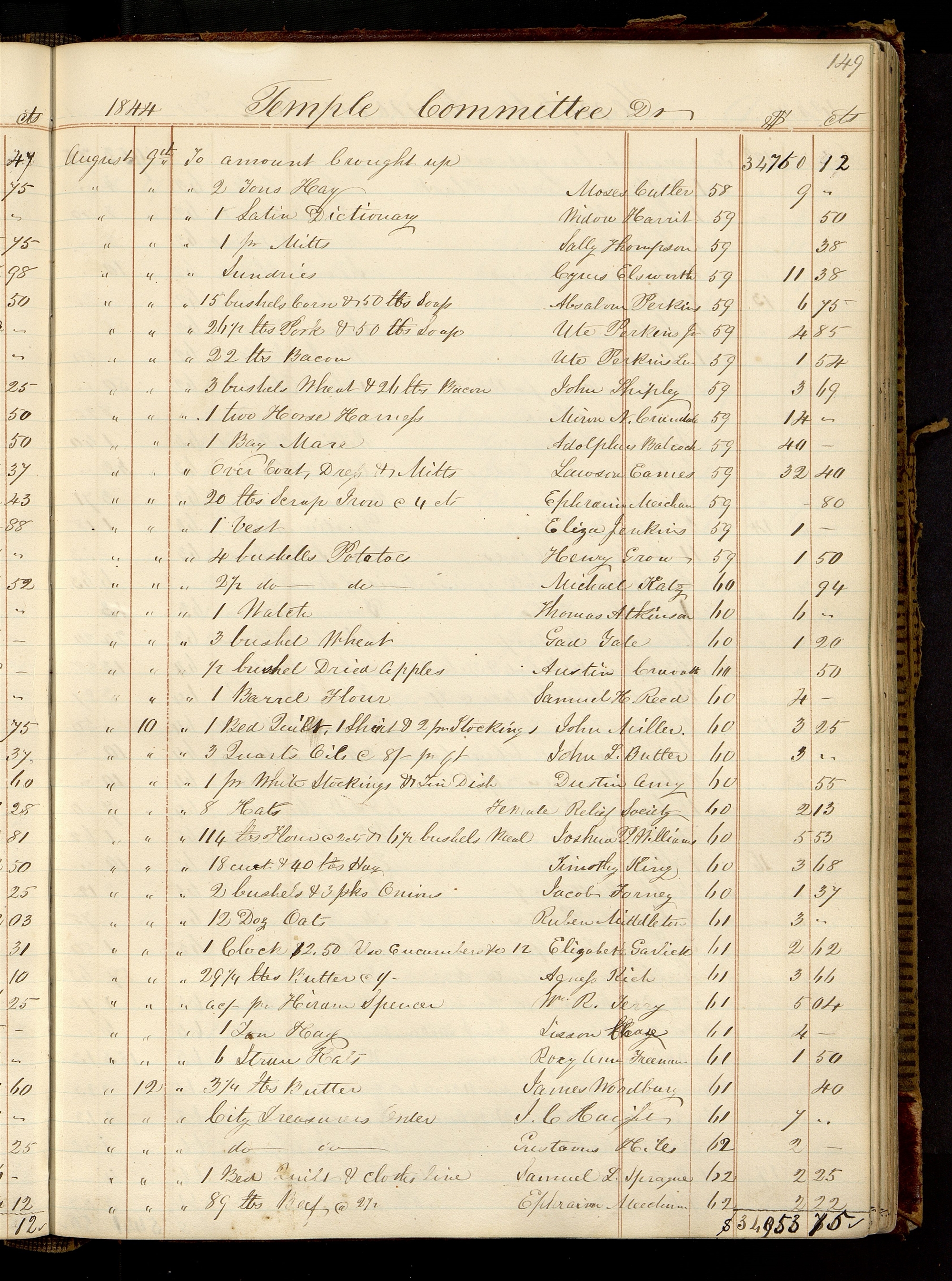 This likely led to the inscription of “Temple Committee Book A” on the spine of the volume. Some have mistaken this as an indication that this record book belonged to the Nauvoo temple committee; however, these are not temple committee records but rather accounts between the trustee-in-trust office and the Nauvoo temple committee.