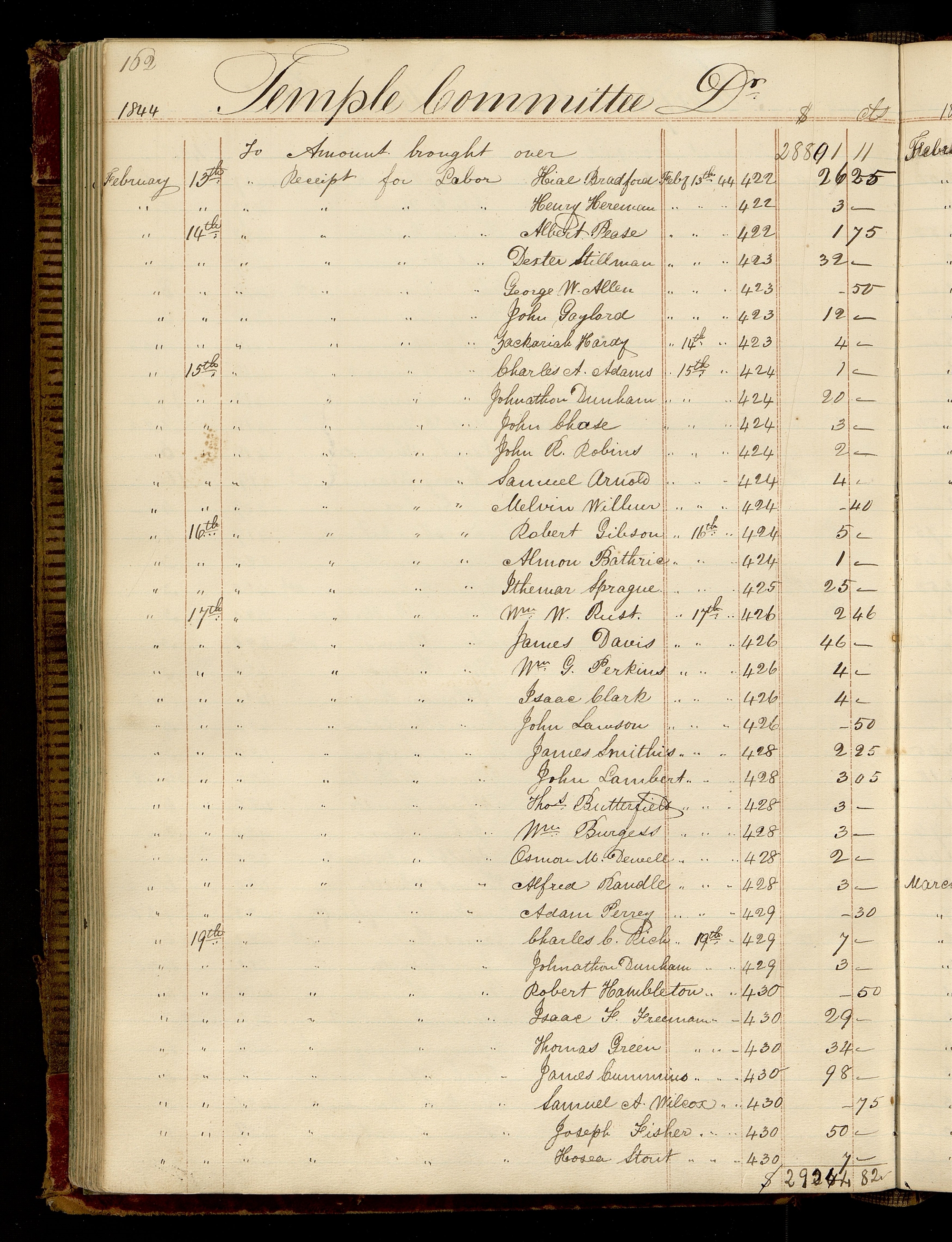 This likely led to the inscription of “Temple Committee Book A” on the spine of the volume. Some have mistaken this as an indication that this record book belonged to the Nauvoo temple committee; however, these are not temple committee records but rather accounts between the trustee-in-trust office and the Nauvoo temple committee.