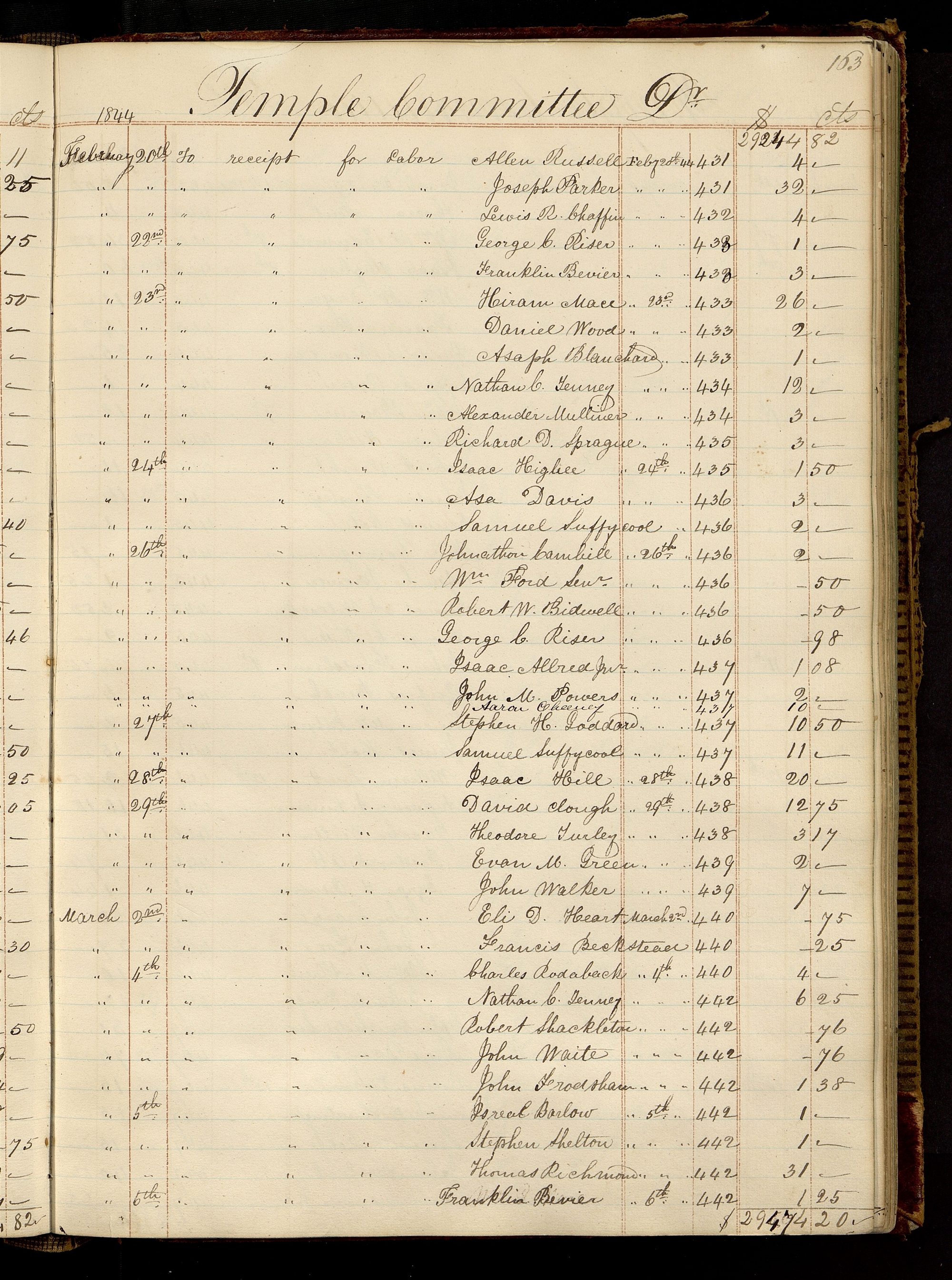 This likely led to the inscription of “Temple Committee Book A” on the spine of the volume. Some have mistaken this as an indication that this record book belonged to the Nauvoo temple committee; however, these are not temple committee records but rather accounts between the trustee-in-trust office and the Nauvoo temple committee.