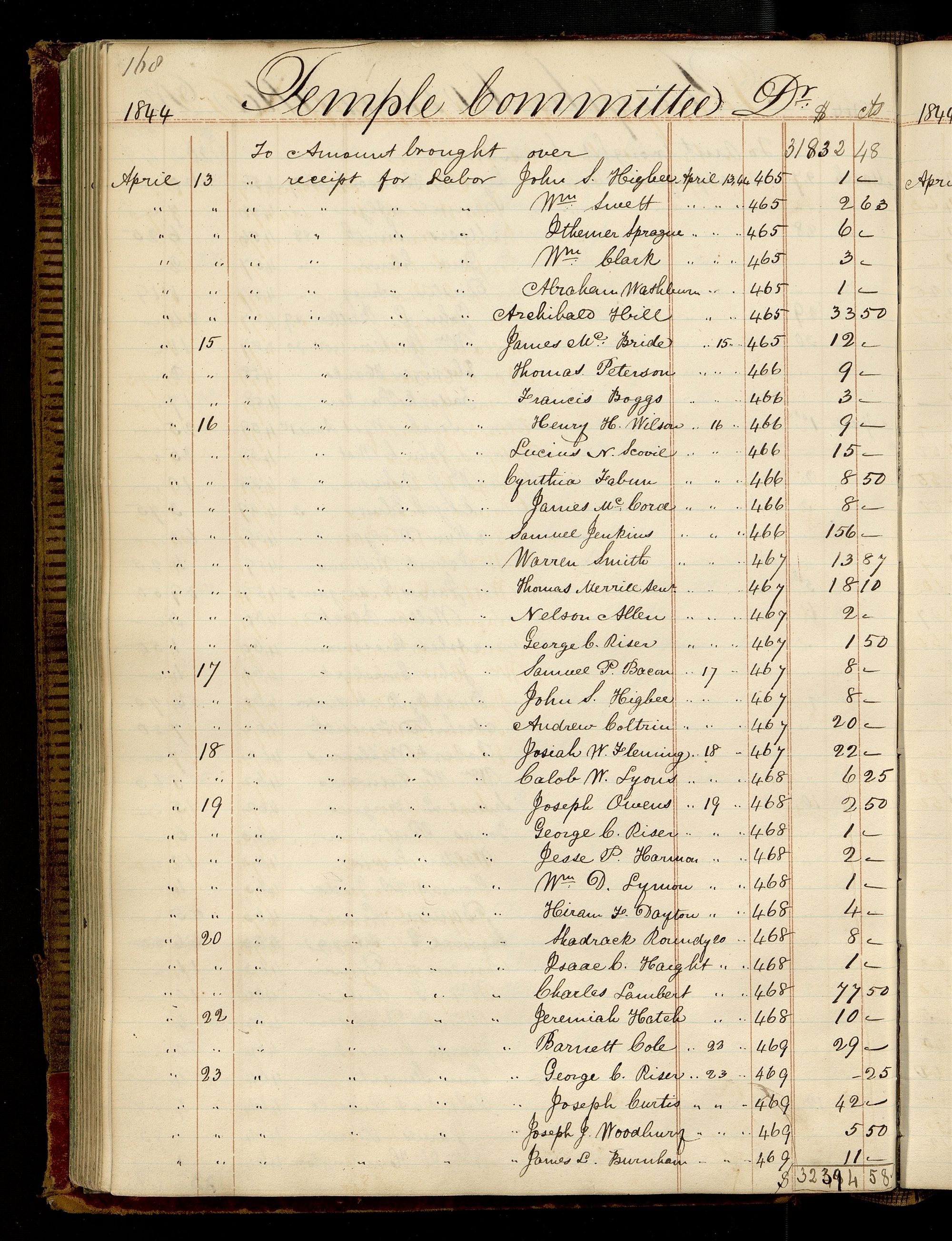 This likely led to the inscription of “Temple Committee Book A” on the spine of the volume. Some have mistaken this as an indication that this record book belonged to the Nauvoo temple committee; however, these are not temple committee records but rather accounts between the trustee-in-trust office and the Nauvoo temple committee.
