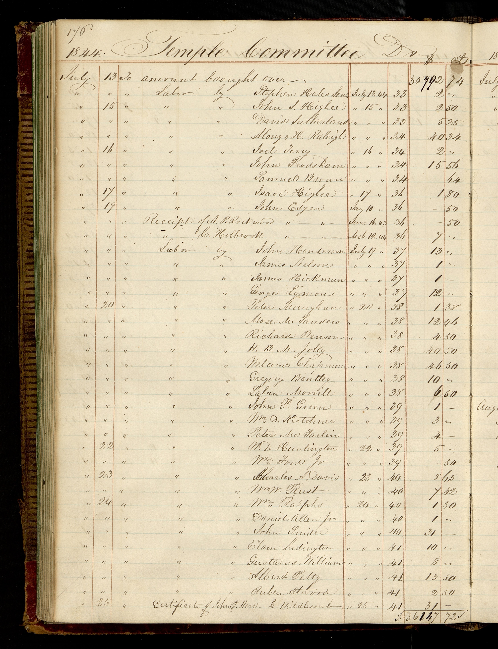 This likely led to the inscription of “Temple Committee Book A” on the spine of the volume. Some have mistaken this as an indication that this record book belonged to the Nauvoo temple committee; however, these are not temple committee records but rather accounts between the trustee-in-trust office and the Nauvoo temple committee.