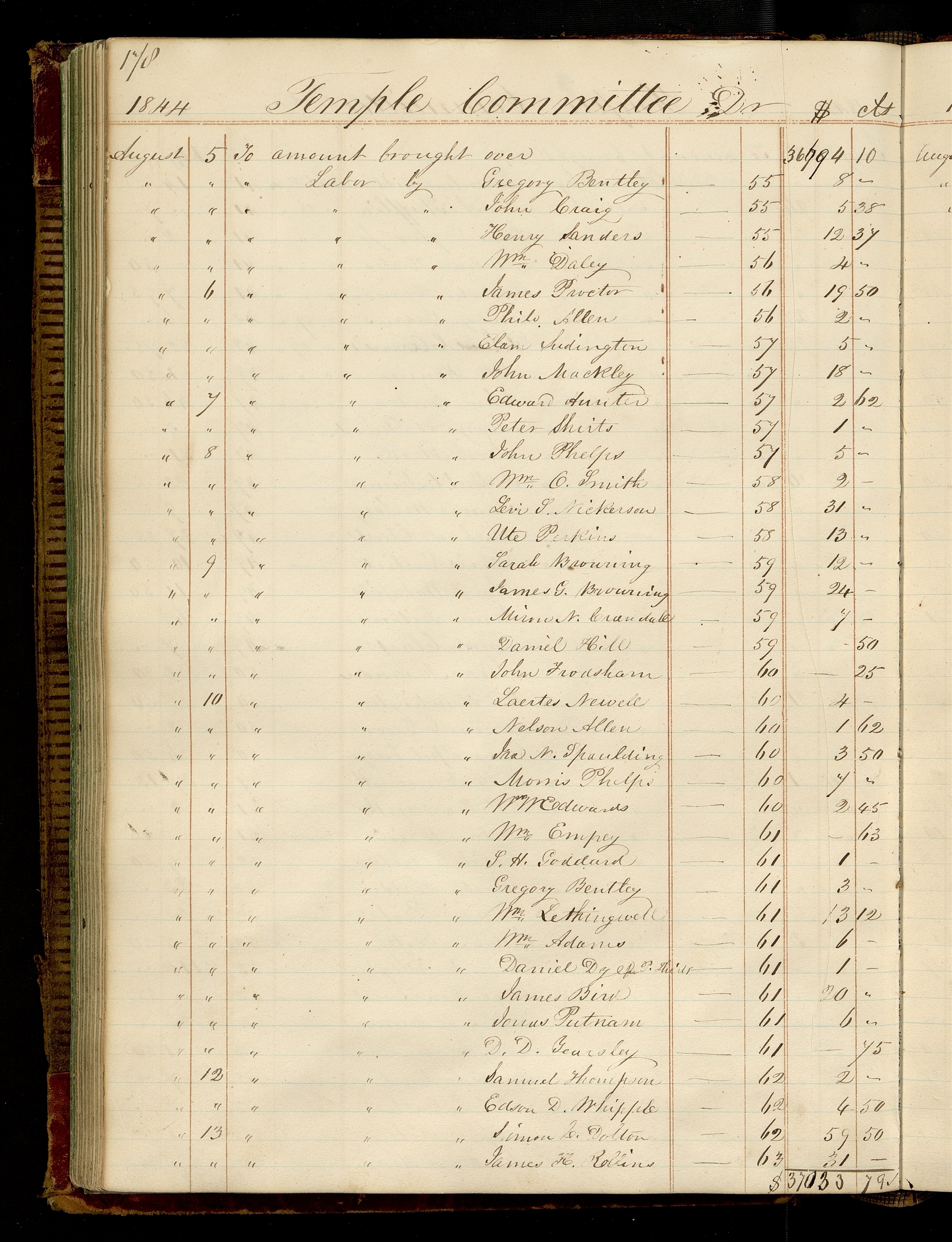 This likely led to the inscription of “Temple Committee Book A” on the spine of the volume. Some have mistaken this as an indication that this record book belonged to the Nauvoo temple committee; however, these are not temple committee records but rather accounts between the trustee-in-trust office and the Nauvoo temple committee.