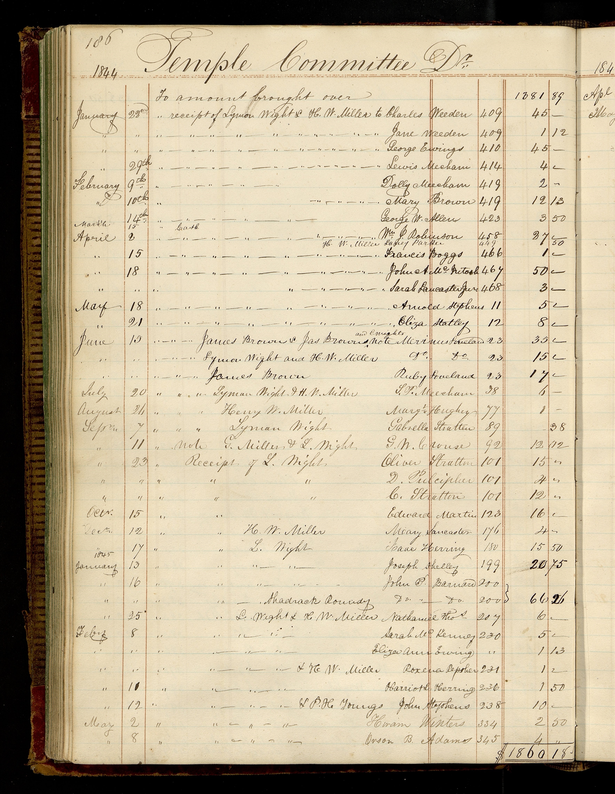 This likely led to the inscription of “Temple Committee Book A” on the spine of the volume. Some have mistaken this as an indication that this record book belonged to the Nauvoo temple committee; however, these are not temple committee records but rather accounts between the trustee-in-trust office and the Nauvoo temple committee.