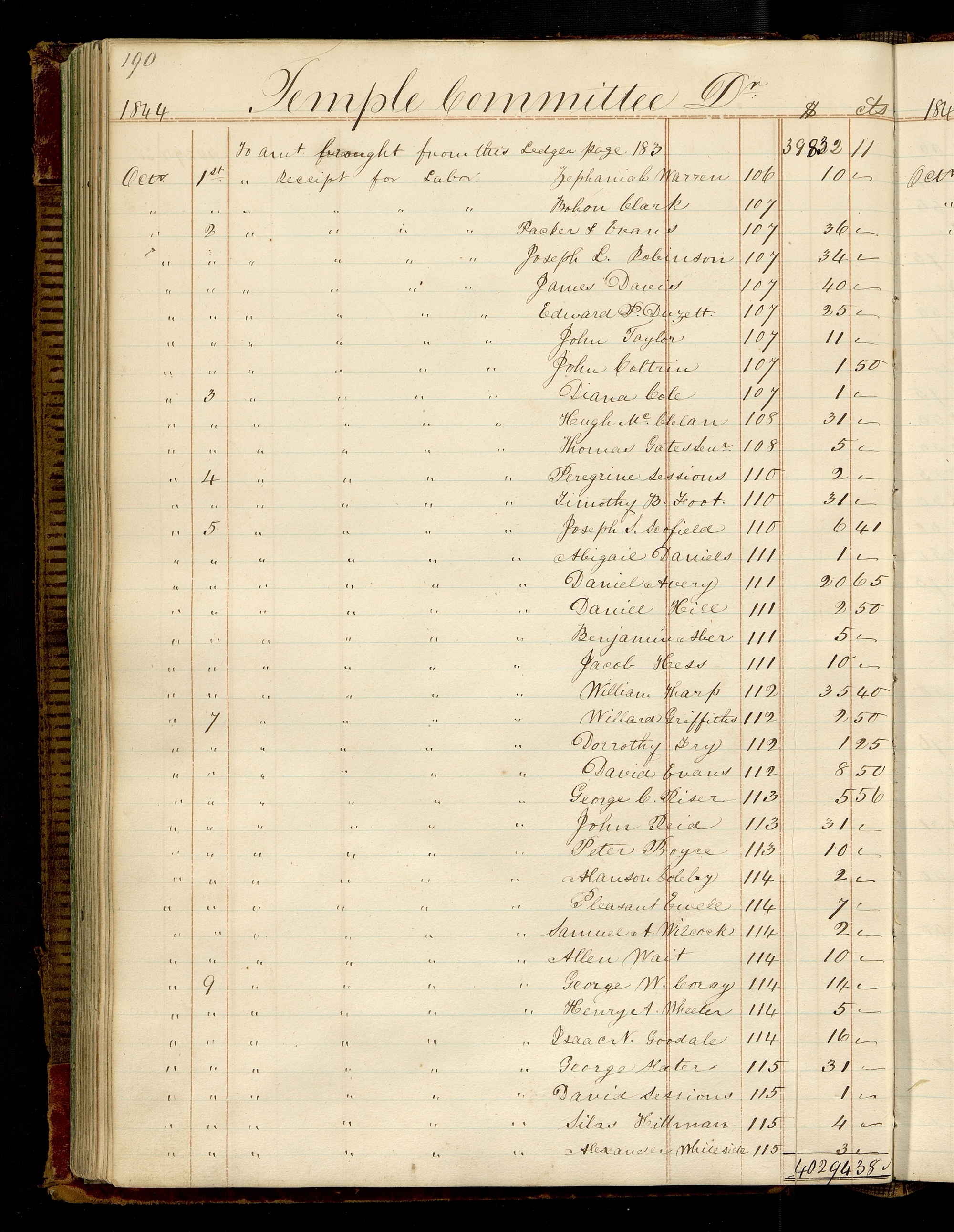 This likely led to the inscription of “Temple Committee Book A” on the spine of the volume. Some have mistaken this as an indication that this record book belonged to the Nauvoo temple committee; however, these are not temple committee records but rather accounts between the trustee-in-trust office and the Nauvoo temple committee.