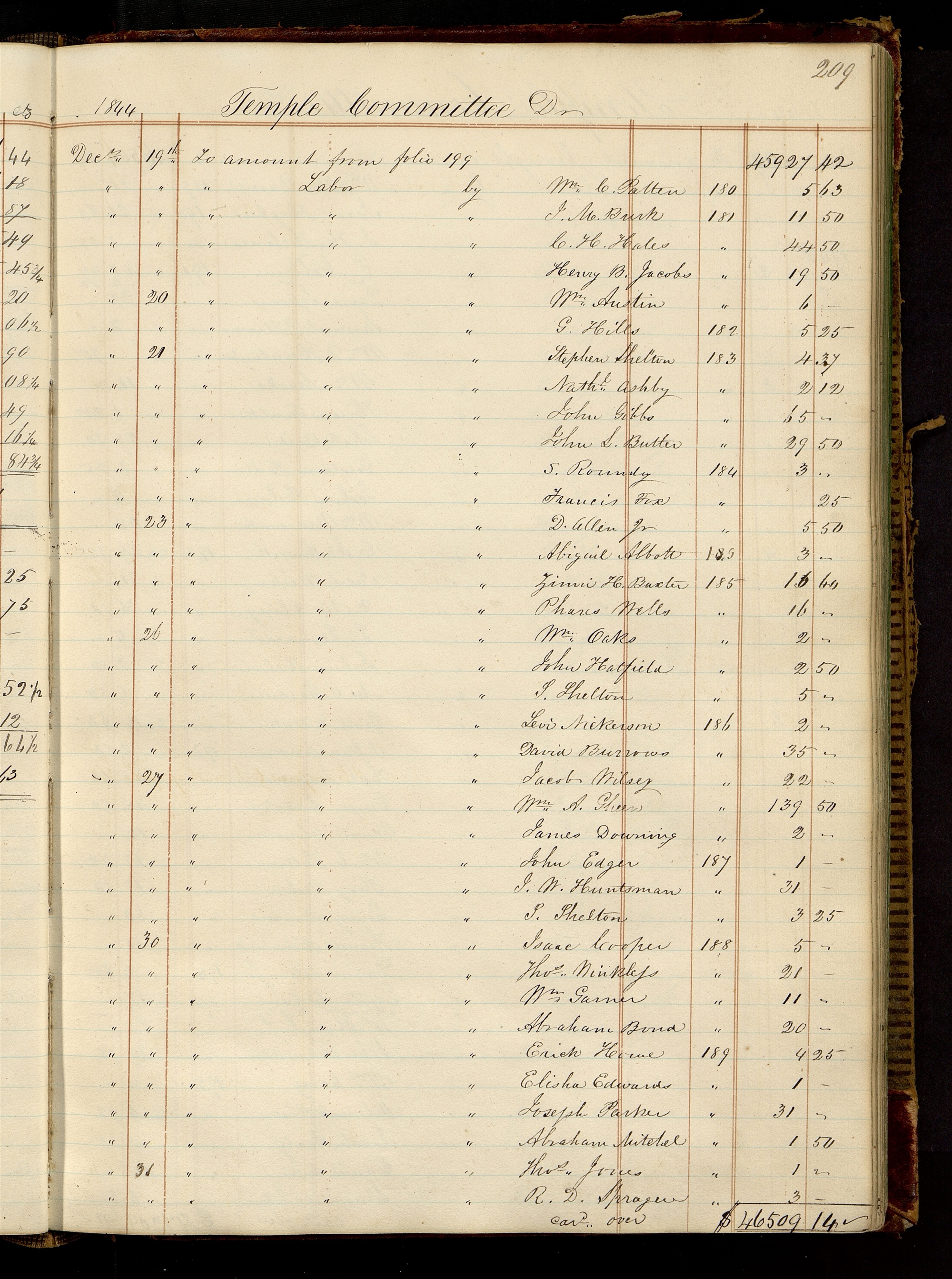 This likely led to the inscription of “Temple Committee Book A” on the spine of the volume. Some have mistaken this as an indication that this record book belonged to the Nauvoo temple committee; however, these are not temple committee records but rather accounts between the trustee-in-trust office and the Nauvoo temple committee.