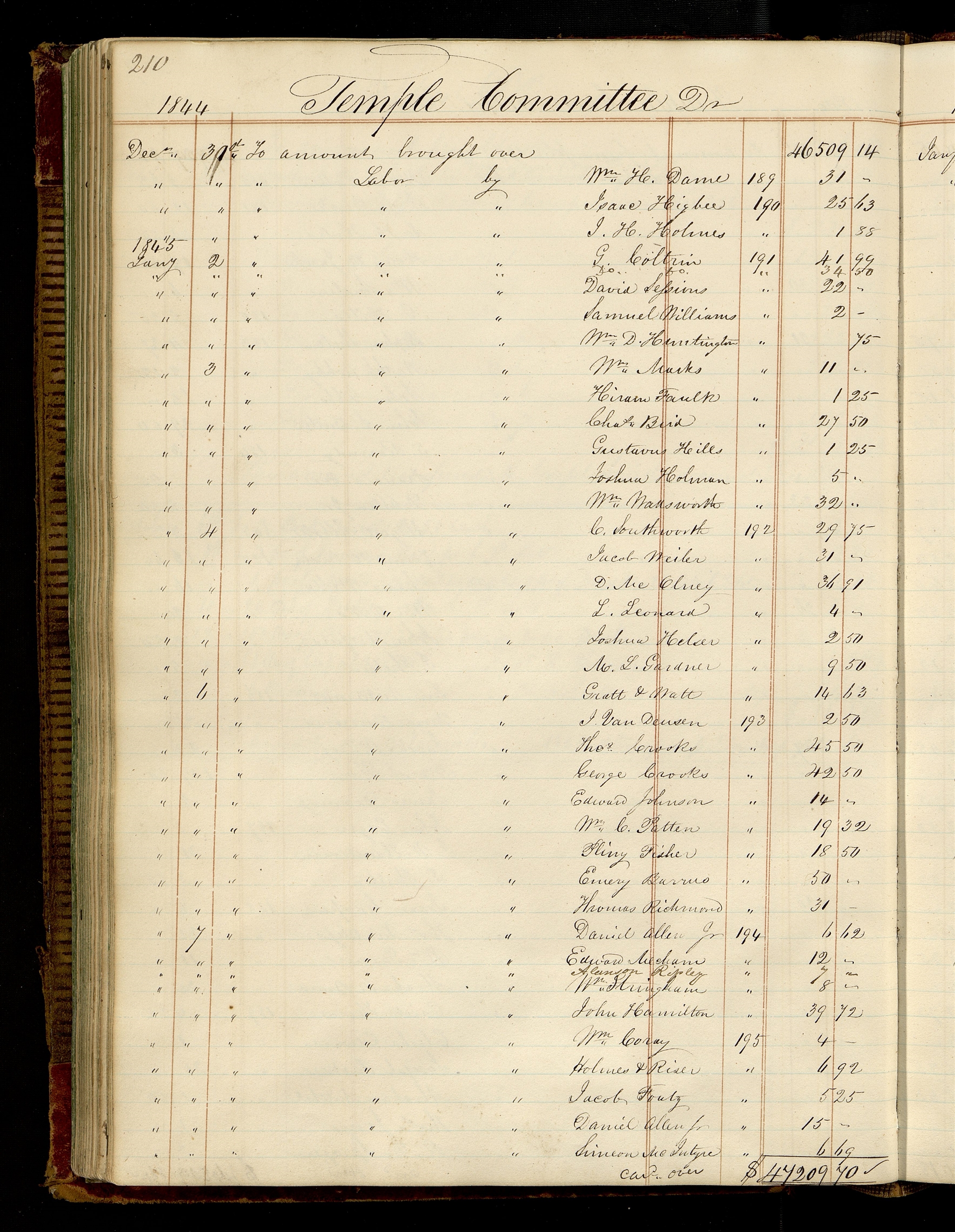 This likely led to the inscription of “Temple Committee Book A” on the spine of the volume. Some have mistaken this as an indication that this record book belonged to the Nauvoo temple committee; however, these are not temple committee records but rather accounts between the trustee-in-trust office and the Nauvoo temple committee.