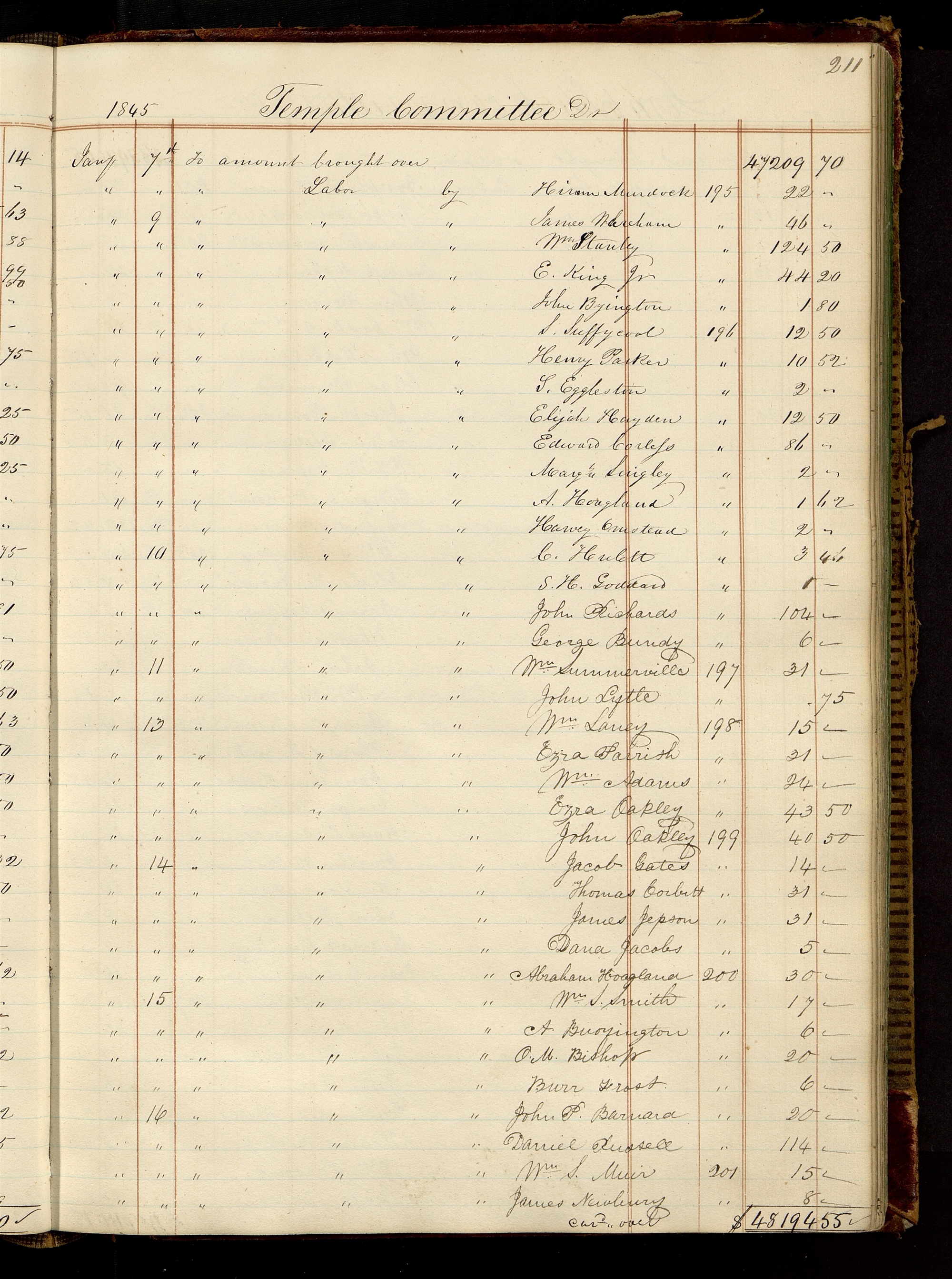 This likely led to the inscription of “Temple Committee Book A” on the spine of the volume. Some have mistaken this as an indication that this record book belonged to the Nauvoo temple committee; however, these are not temple committee records but rather accounts between the trustee-in-trust office and the Nauvoo temple committee.