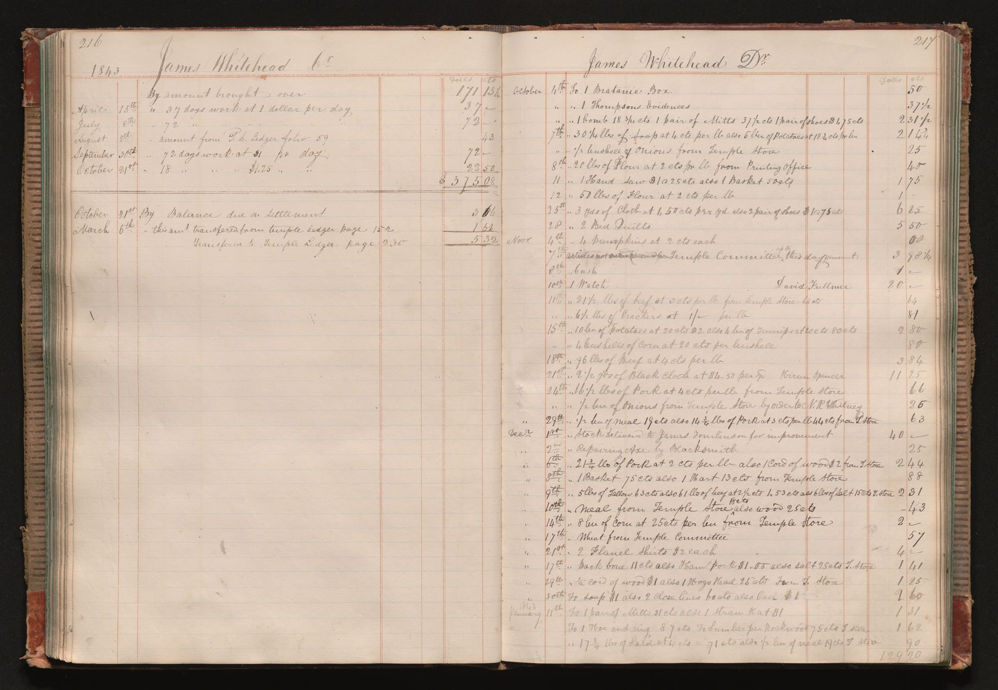 This likely led to the inscription of “Temple Committee Book A” on the spine of the volume. Some have mistaken this as an indication that this record book belonged to the Nauvoo temple committee; however, these are not temple committee records but rather accounts between the trustee-in-trust office and the Nauvoo temple committee.