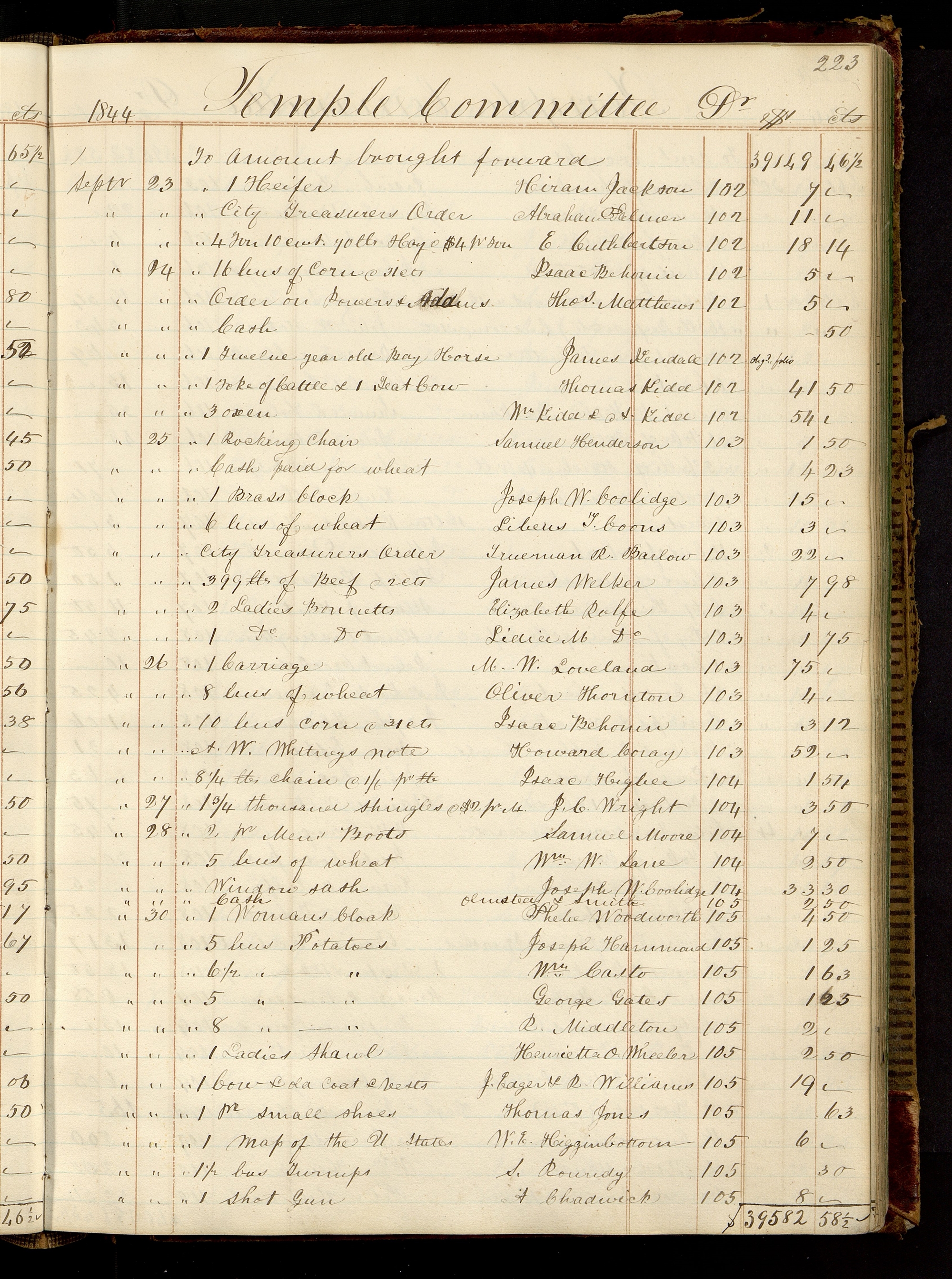 This likely led to the inscription of “Temple Committee Book A” on the spine of the volume. Some have mistaken this as an indication that this record book belonged to the Nauvoo temple committee; however, these are not temple committee records but rather accounts between the trustee-in-trust office and the Nauvoo temple committee.