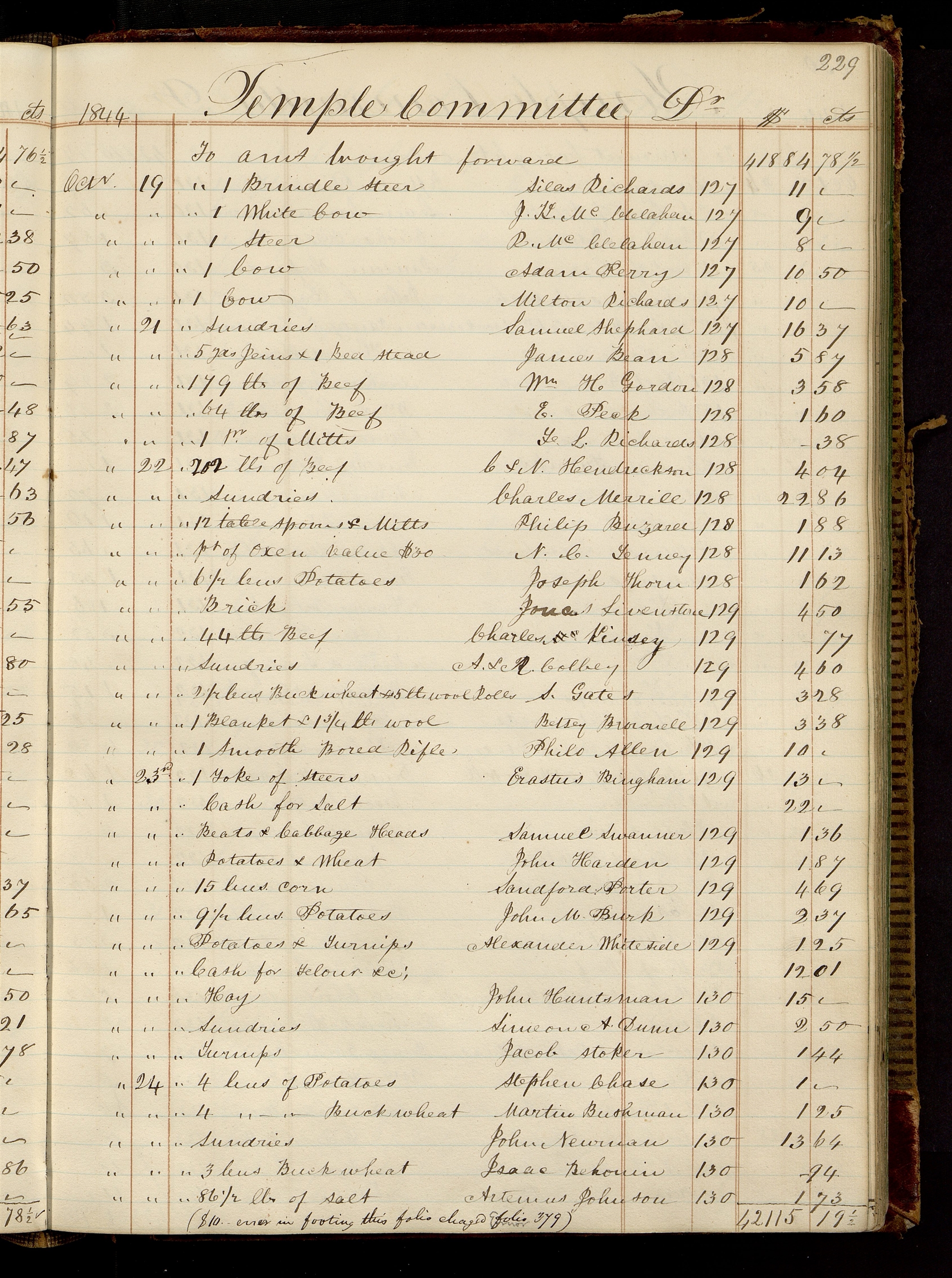 This likely led to the inscription of “Temple Committee Book A” on the spine of the volume. Some have mistaken this as an indication that this record book belonged to the Nauvoo temple committee; however, these are not temple committee records but rather accounts between the trustee-in-trust office and the Nauvoo temple committee.