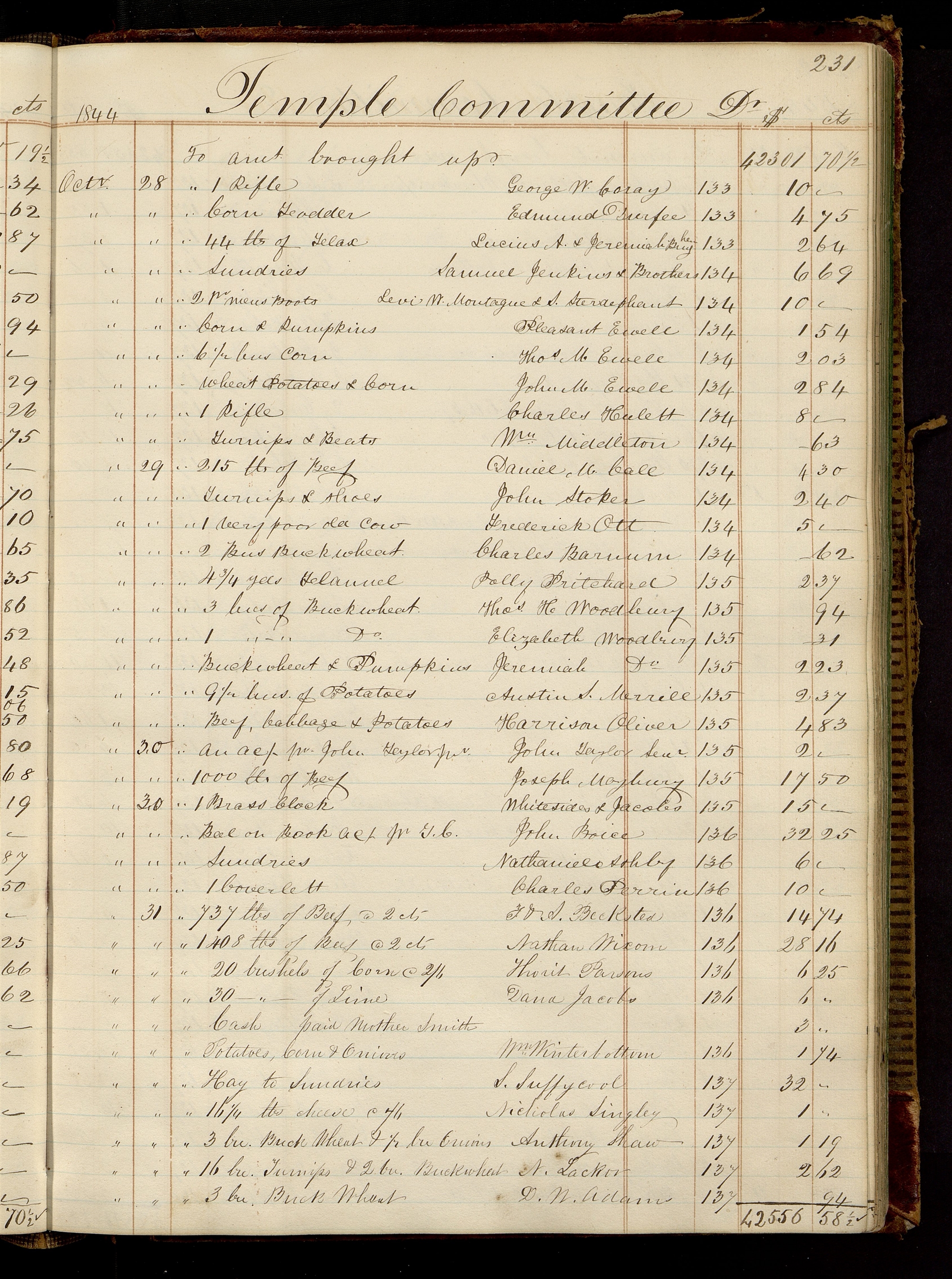 This likely led to the inscription of “Temple Committee Book A” on the spine of the volume. Some have mistaken this as an indication that this record book belonged to the Nauvoo temple committee; however, these are not temple committee records but rather accounts between the trustee-in-trust office and the Nauvoo temple committee.