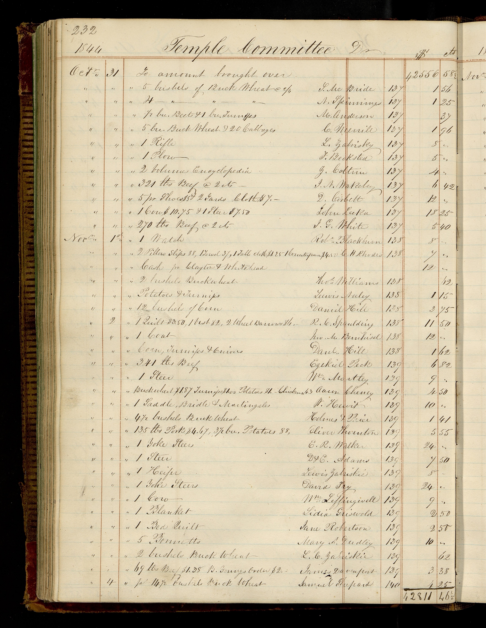 | [Novr.] 2 | [To] 1 Quilt $3.50, 1 Vest $2.00, 2 Wheel Barrows $6.00 | R. C. Spaulding | 138 | 11.50 |