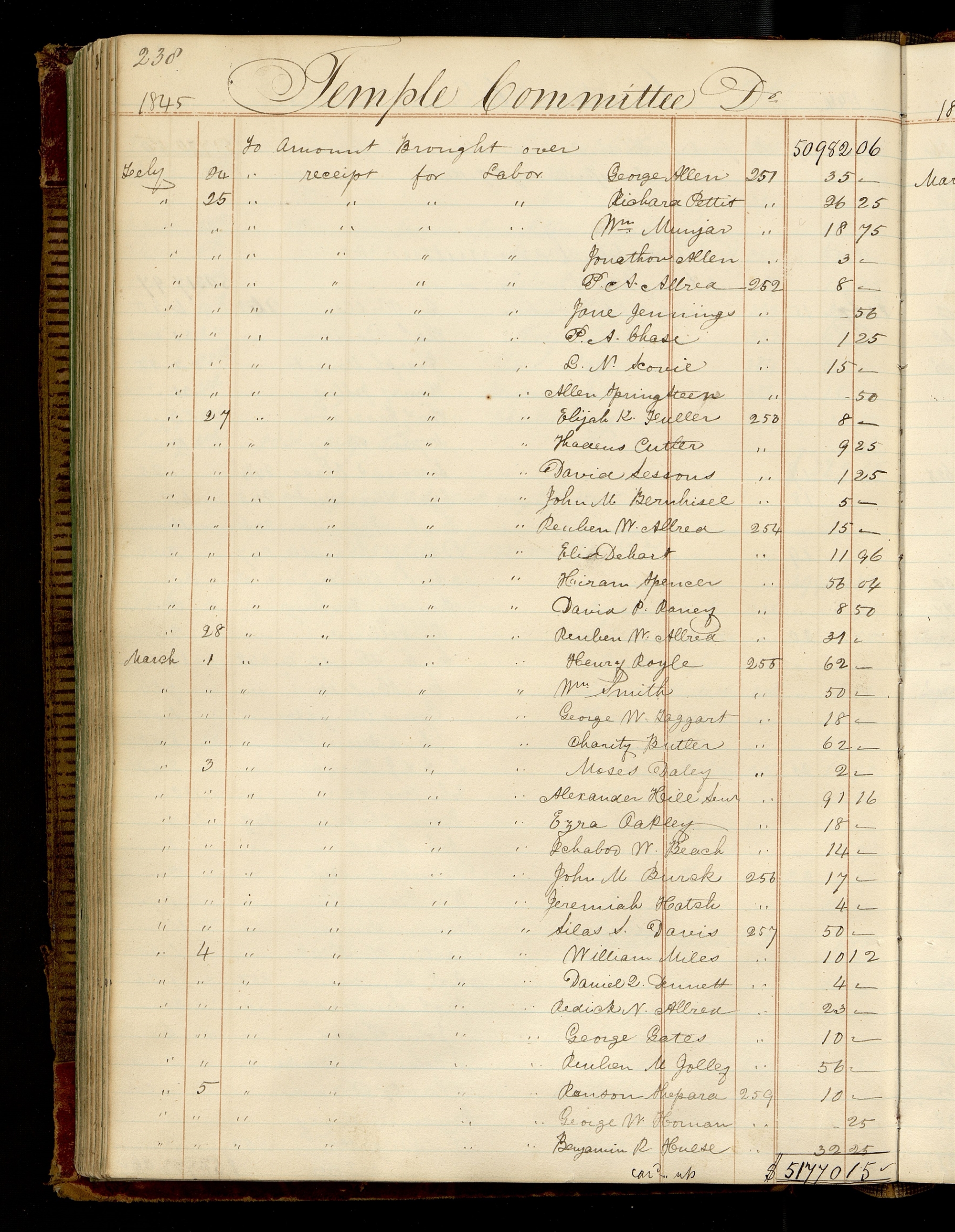 This likely led to the inscription of “Temple Committee Book A” on the spine of the volume. Some have mistaken this as an indication that this record book belonged to the Nauvoo temple committee; however, these are not temple committee records but rather accounts between the trustee-in-trust office and the Nauvoo temple committee.